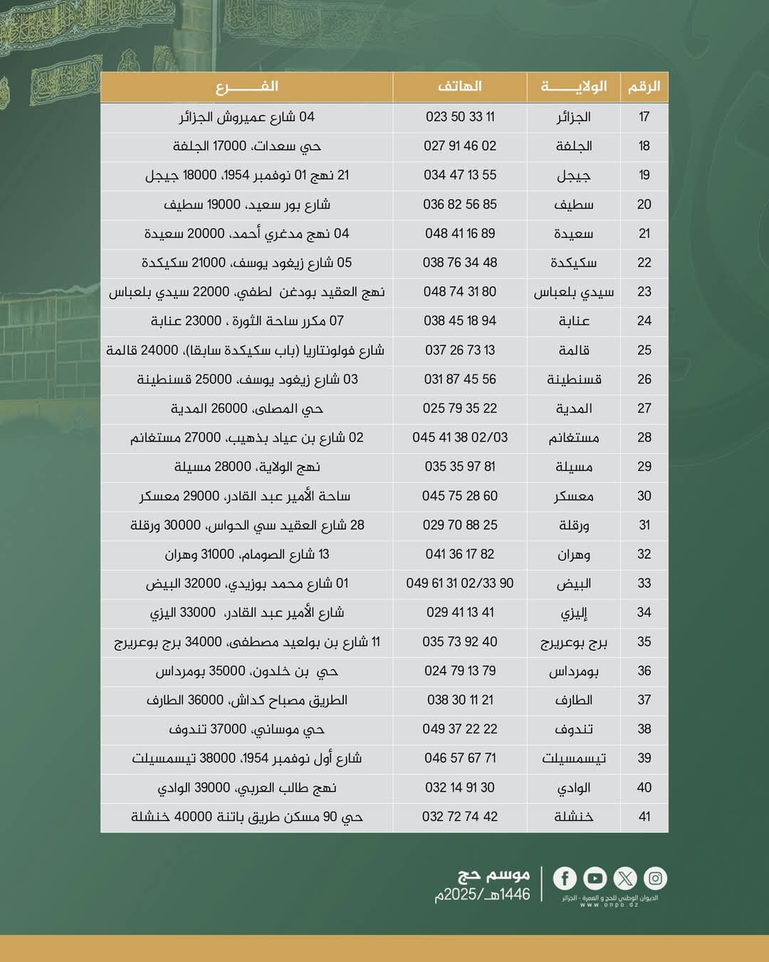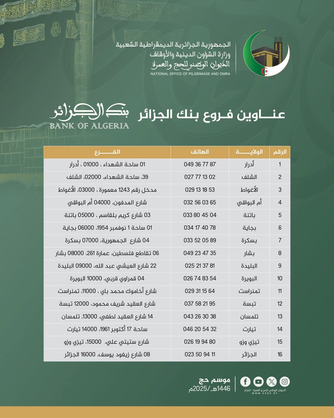 الجزائرالٱن _ وجه الديوان الوطني للحج والعمرة نداء عاجل الى الحجاج تزامنا مع إنطلاق عملية دفع تكلفة الحج عبر جميع فروع Bank of Algeria-بنك الجزائر .