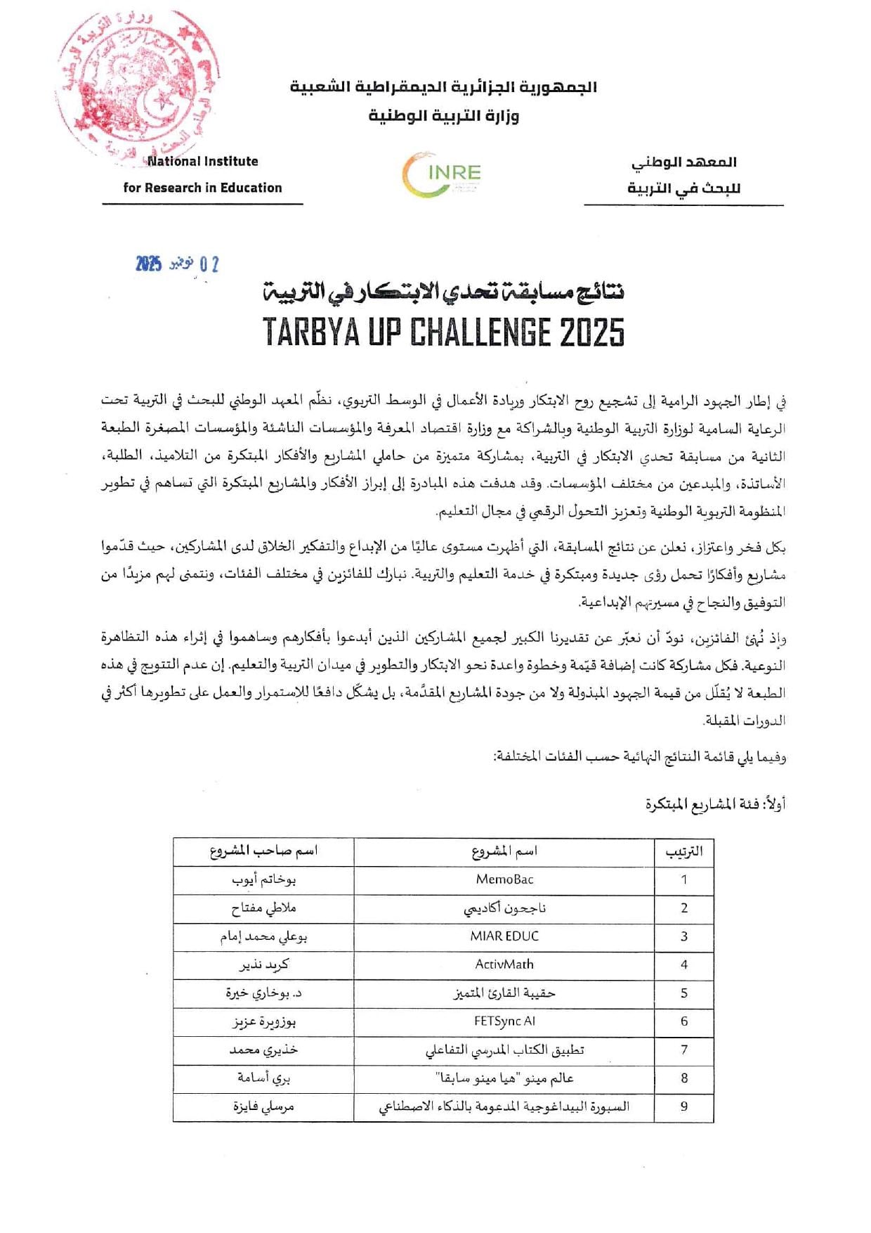 الجزائرالٱن _ أفرج اليوم المعهد الوطني للبحث في التربية عن نتائج مسابقة تحدي الابتكار في التربية TARBYA” UP CHALLENGE 2025″.