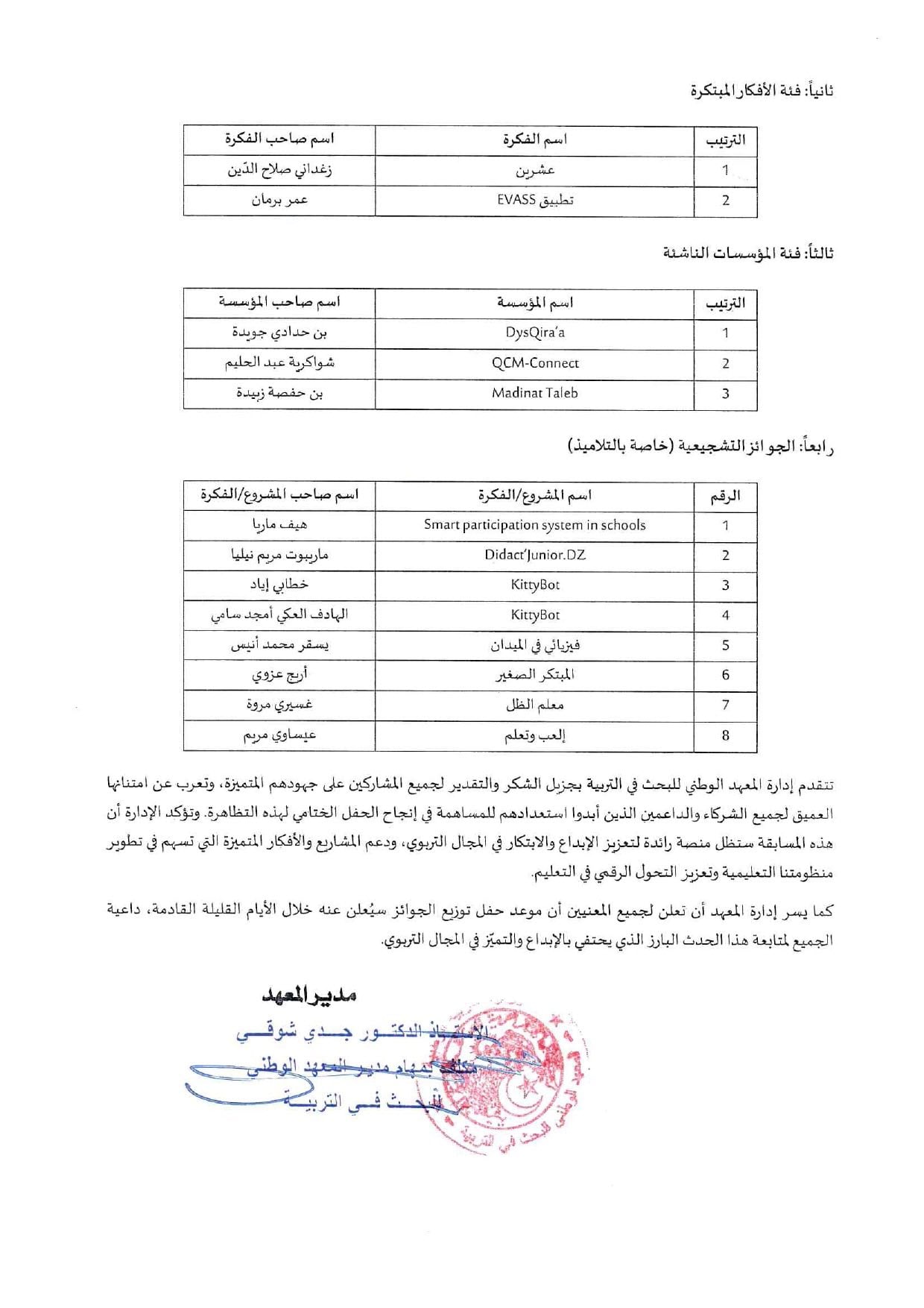 وهنئ المعهد الفائزين، معبرا عن تقديره الكبير لجميع المشاركين الذين أبدعوا بأفكارهم وساهموا في إثراء هذه التظاهرة النوعية” فكل مشاركة كانت إضافة قيمة وخطوة واعدة نحو الابتكار والتطوير في ميدان التربية والتعليم”، يضيف البيان” مستطردا قائلا” إن عدم التتويج في هذه الطبعة لا يُقلل من قيمة الجهود المبذولة ولا من جودة المشاريع المقدمة، بل يشكل دافعا للاستمرار والعمل على تطويرها أكثر في الدورات المقبلة.”