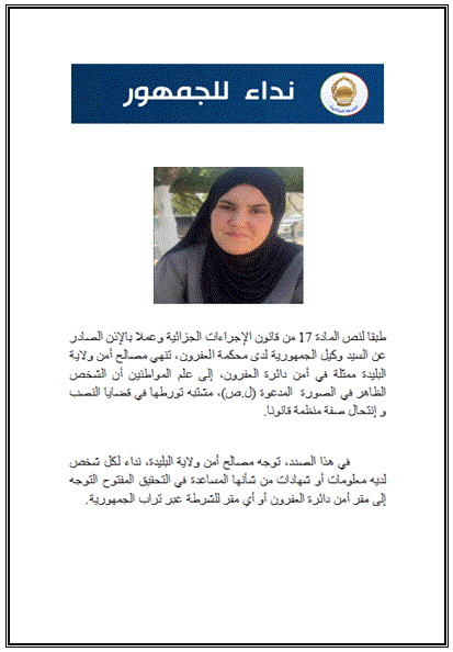 وتظهر في النداء صورة امرأة محجبة، يرجّح أنها استعملت هويّة مزيفة لتنفيذ عمليات احتيال، حسب ما جاء في بيان المصالح الأمنية. وأفاد المصدر ذاته بأن التحقيق مفتوح لتحديد هوية المعنية، وتوقيفها في أسرع وقت ممكن.