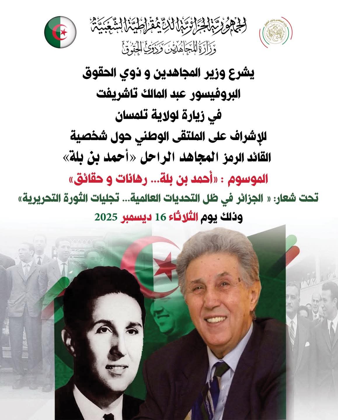 الجزائرالٱن _ يشرع وزير المجاهدين وذوي الحقوق، عبد المالك تاشريفات، في زيارة رسمية إلى ولاية تلمسان، للإشراف على فعاليات ملتقى وطني مخصص لشخصية القائد والرمز المجاهد الراحل أحمد بن بلة، أحد أبرز صناع تاريخ الجزائر المعاصر.