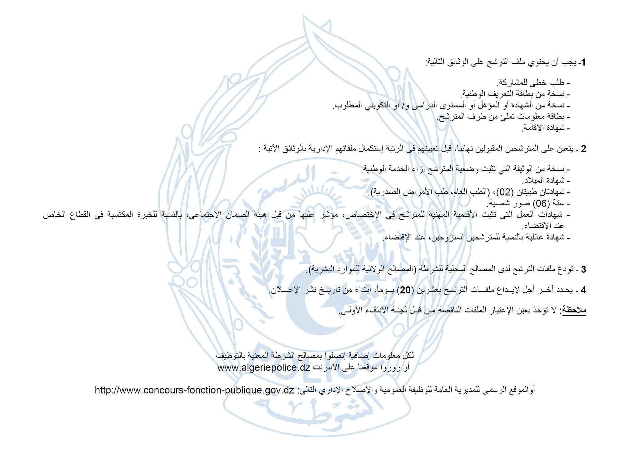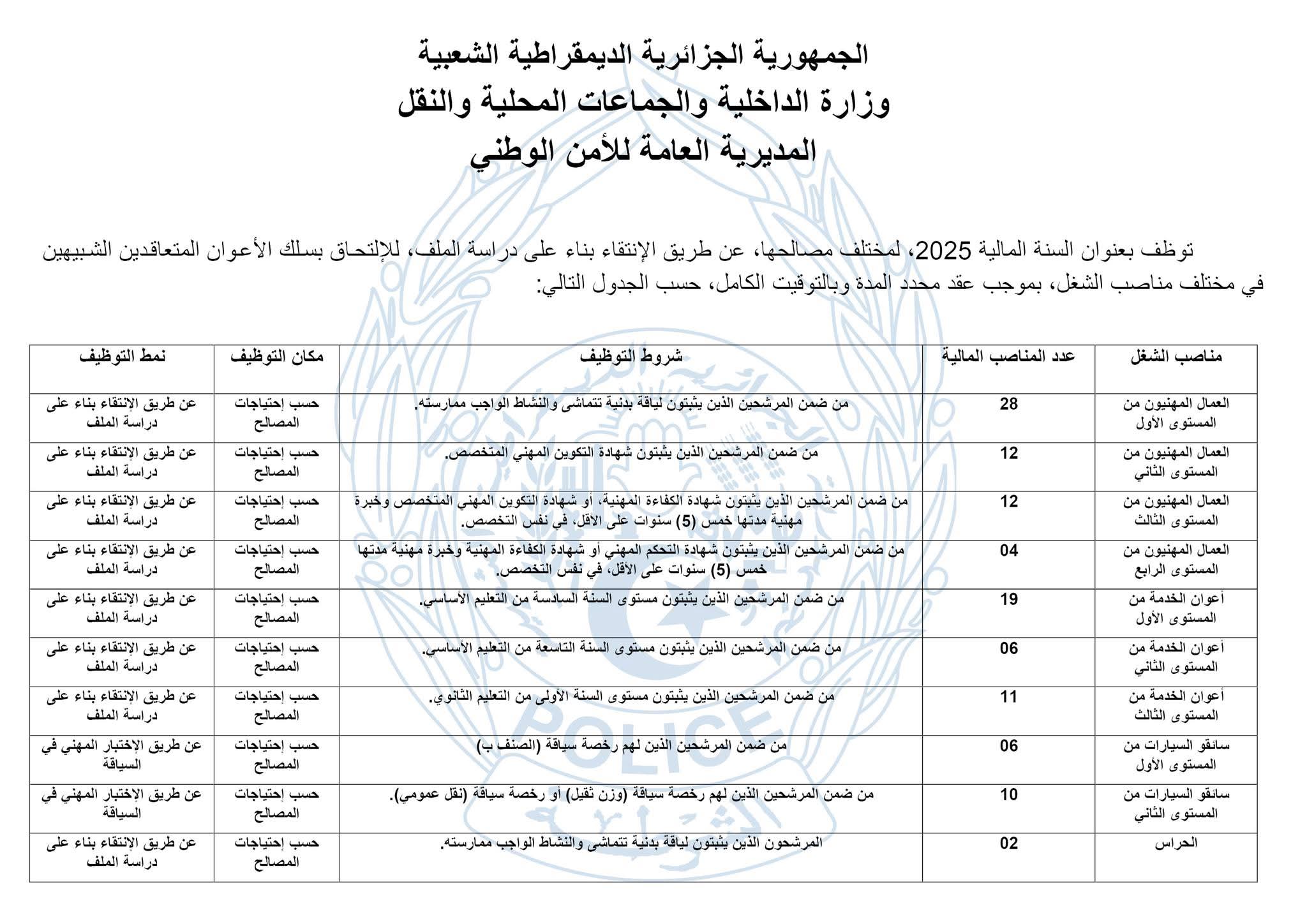 الجزائرالٱن _ اعلنت المديرية العامة لـالأمن الوطني، عن إطلاق بعنوان سنة 2025، مسابقة لتوظيف الأعوان المتعاقدين الشبيهين في مختلف مناصب الشغل، عن طريق الإنتقاء بناء على دراسة الملف، بموجب عقد محدد المدة وبالتوقيت الكامل.