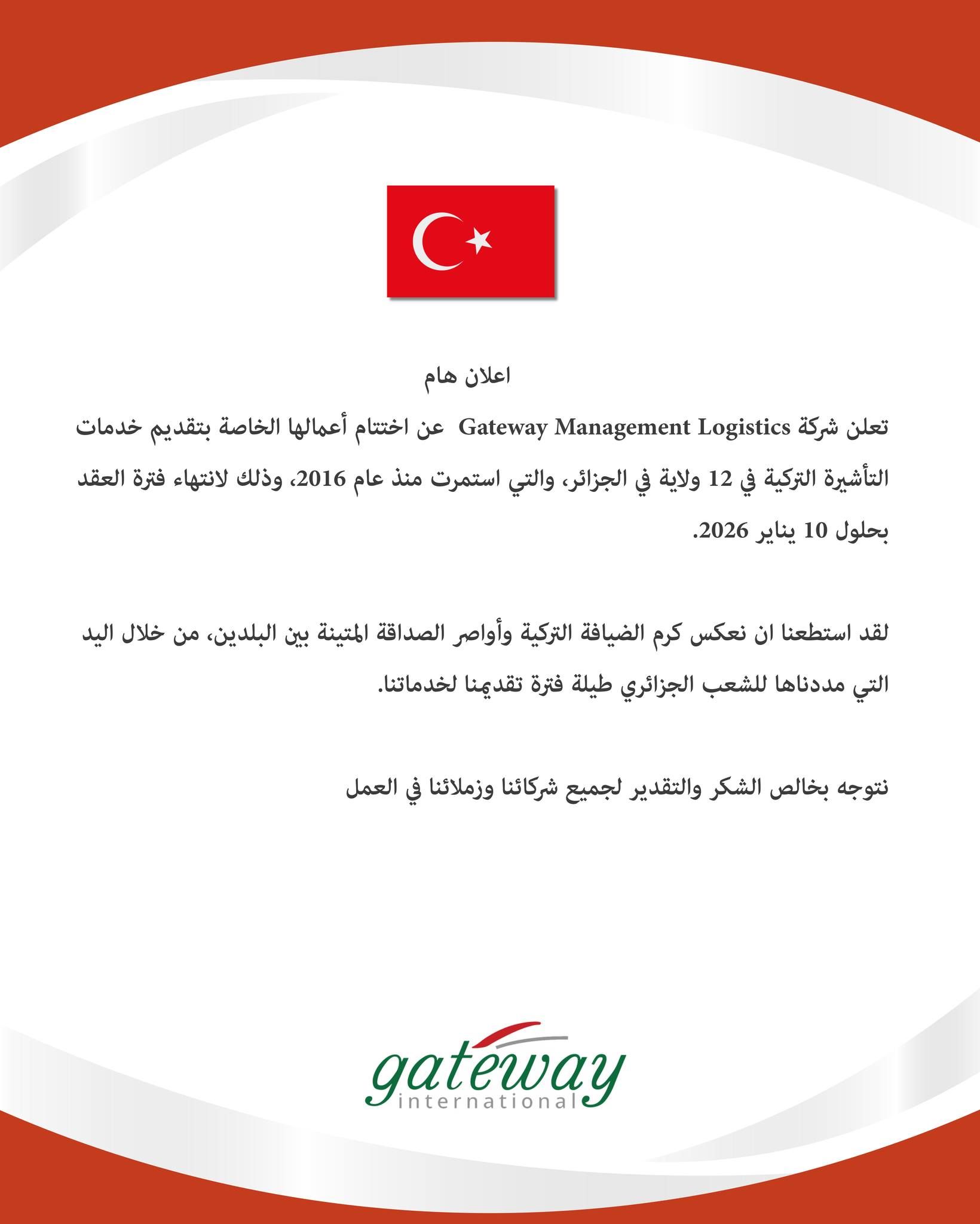 وأوضحت شركة "Gateway Management Logistics" مركز تقديم طلبات التأشيرة التركية بالجزائر في إعلان لها، أنها حرصت خلال فترة نشاطها طيلة السنوات الماضية على مدّ يد التعاون للشعب الجزائري، في إطار يعكس كرم الضيافة التركية وأواصر الصداقة المتينة التي تجمع بين البلدين