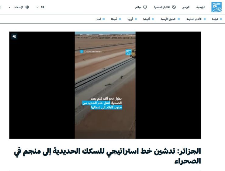 كما واكب راديو فرنسا الدولي (RFI) دخول الخط السككيّ المنجميّ الغربي حيز الخدمة، معتبرًا إياه "أكبر مشروع استراتيجي في تاريخ الجزائر المستقلة"، ويعكس طموحات الرئيس عبد المجيد تبون. وأوضح أن خامات الحديد تنطلق من غارا جبيلات نحو تندوف مرورًا ببشار، قبل مواصلة رحلتها شمالًا، في استثمار ضخم بقطاع التعدين.