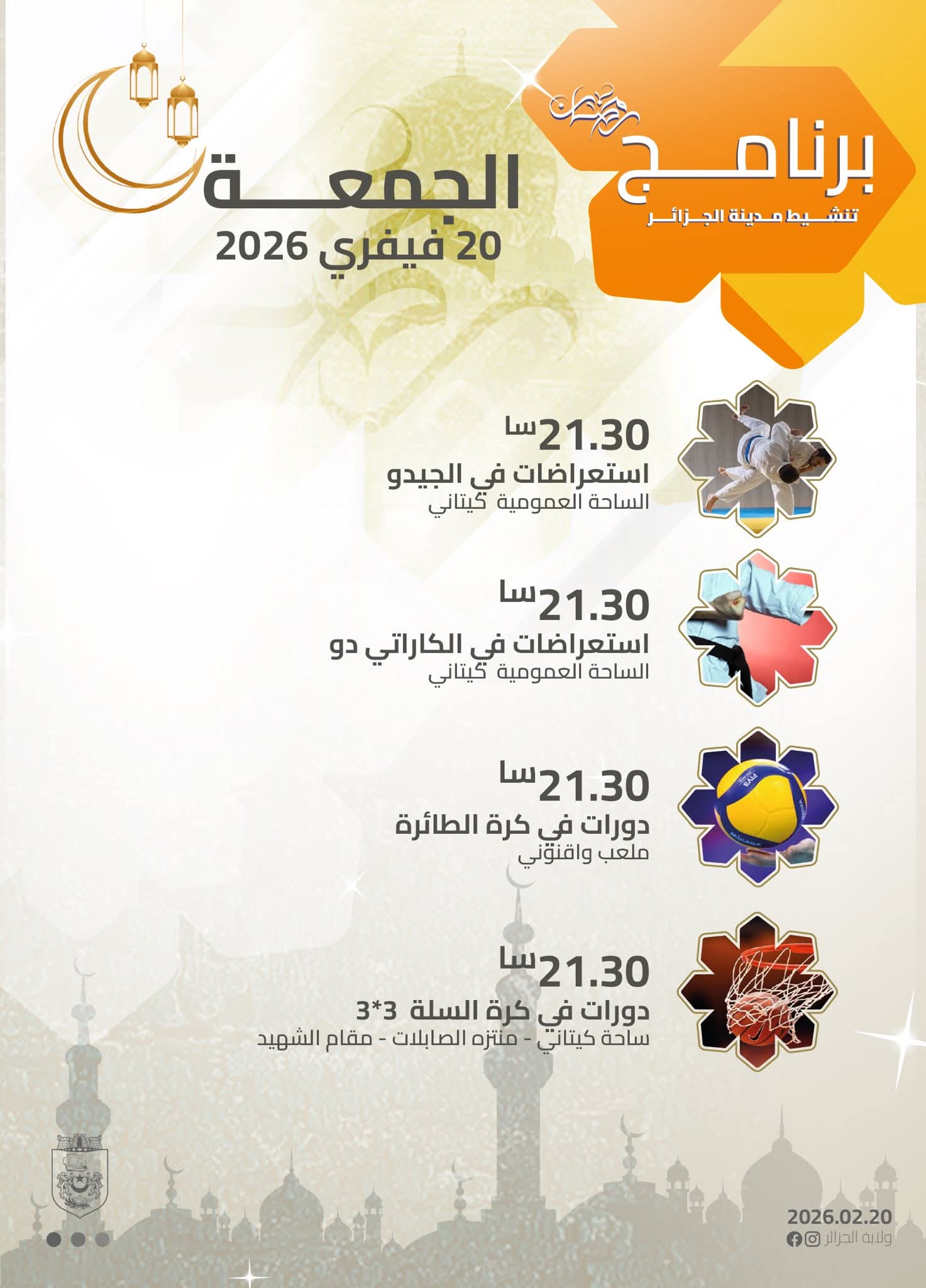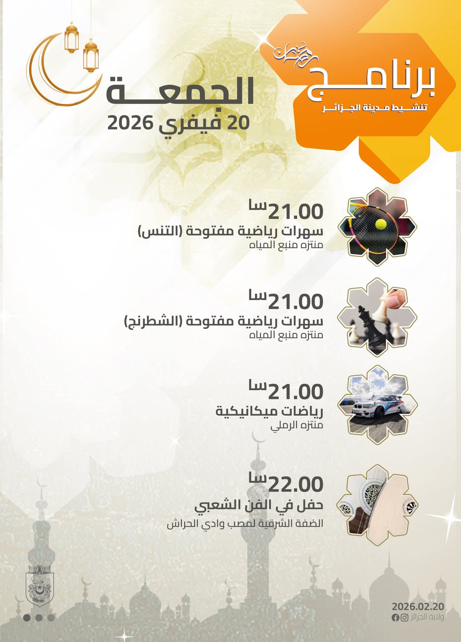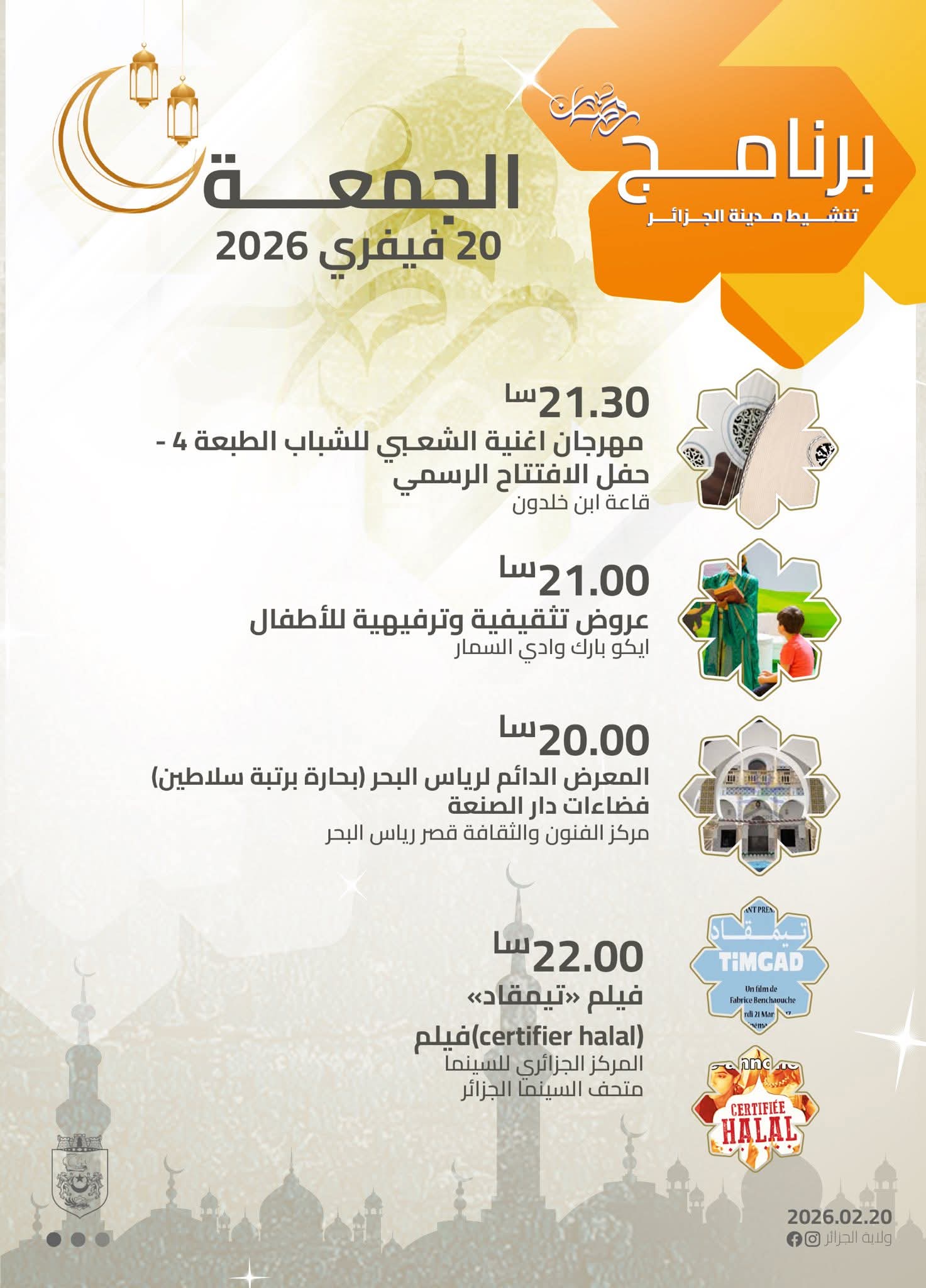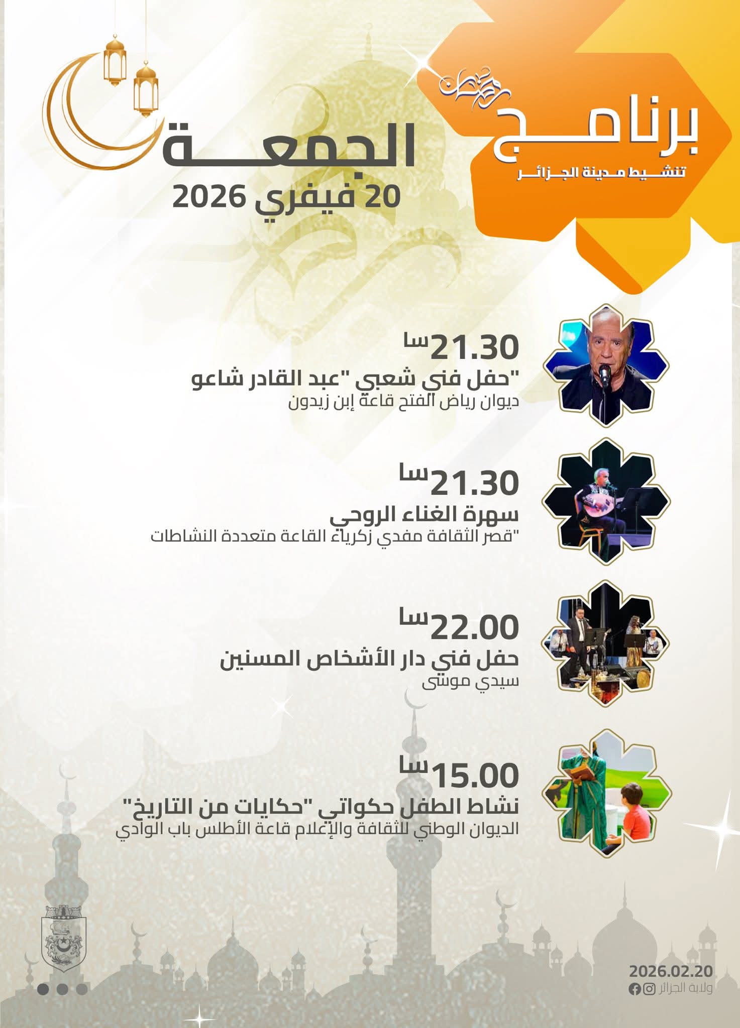 الجزائرالٱن _ تشهد مدينة الجزائر، اليوم الجمعة 20 فيفري 2026، انطلاق برنامج متنوع لتنشيط مختلف الفضاءات العمومية بمناسبة شهر رمضان الفضيل، في إطار جهود إضفاء أجواء احتفالية مميزة على ليالي العاصمة وتعزيز الحركية الثقافية والسياحية.