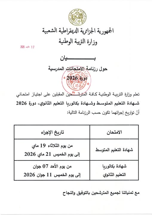 نشرت وزارة التربية الوطنية اليوم رزنامة اجراء امتحانات شهادة التعليم المتوسط وشهادة البكالوريا.
