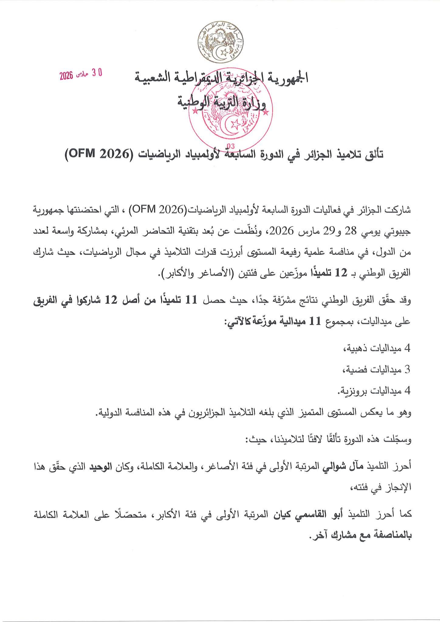 الجزائرالٱن _ حقّق تلاميذ الجزائر إنجازًا مميزًا في الدورة السابعة لأولمبياد الرياضيات (OFM 2026)، التي احتضنتها جمهورية جيبوتي يومي 28 و29 مارس 2026، ونُظمت عن بُعد بمشاركة واسعة من عدة دول، في أجواء تنافسية عالية المستوى.