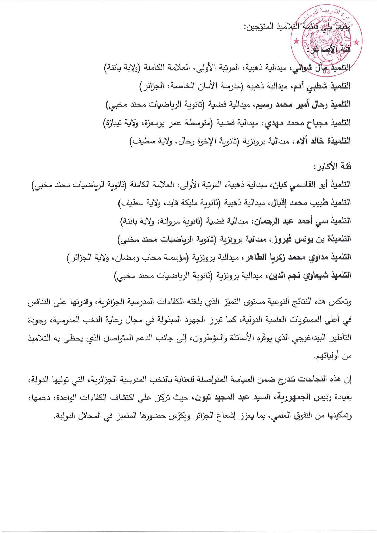 ويأتي هذا الإنجاز في سياق سياسة الدولة الرامية إلى دعم النخب المدرسية وتشجيع التميز العلمي، تحت إشراف السلطات العليا في البلاد، بما يعزز مكانة الجزائر في المحافل الدولية ويؤكد قدرتها على تكوين أجيال مبدعة وقادرة على المنافسة عالميًا.