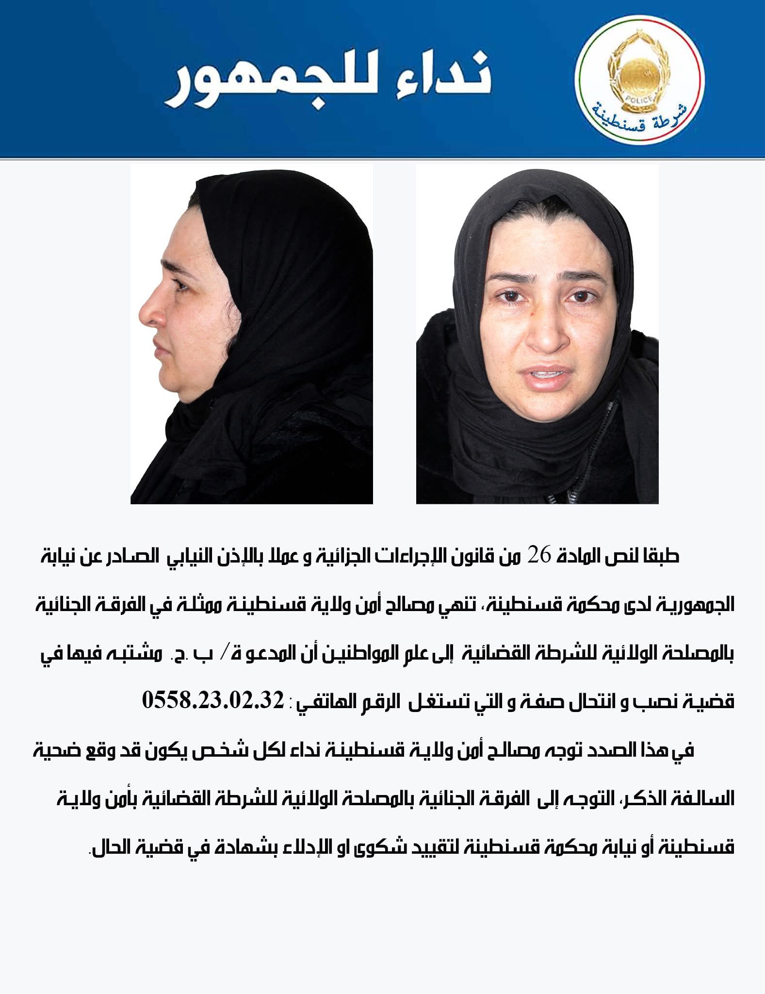 وجاء هذا النداء استنادًا إلى أحكام المادة 26 من قانون الإجراءات الجزائية، وبإذن من نيابة محكمة قسنطينة، حيث كشفت الفرقة الجنائية بالمصلحة الولائية للشرطة القضائية عن هوية مشتبه بها متورطة في انتحال صفة والقيام بعمليات نصب.