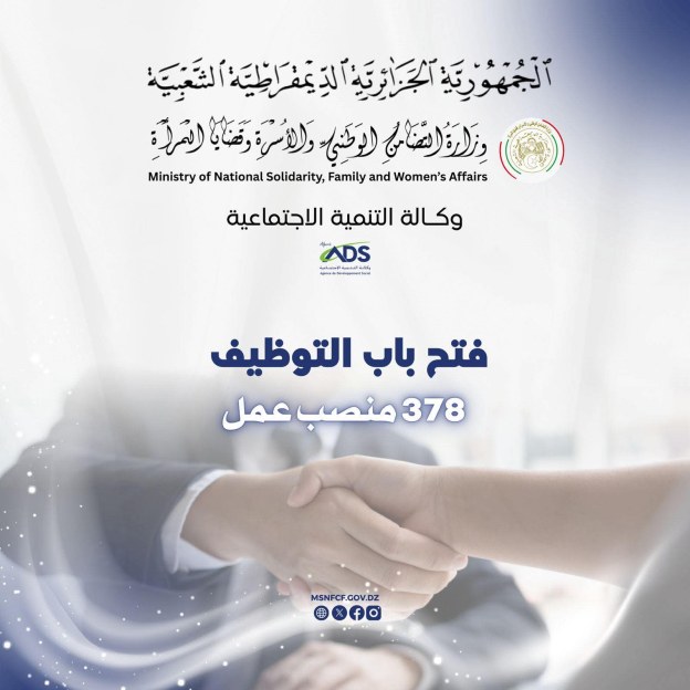 الجزائرالٱن _ أعلنت وزارة التضامن الوطني والأسرة وقضايا المرأة، تحت إشراف الوزيرة الدكتورة صورية مولوجي، عن إطلاق مسابقة توظيف جديدة لفائدة وكالة التنمية الاجتماعية، تشمل 378 منصب عمل موزعة بين مقر المديرية العامة والفروع الجهوية عبر مختلف ولايات الوطن.