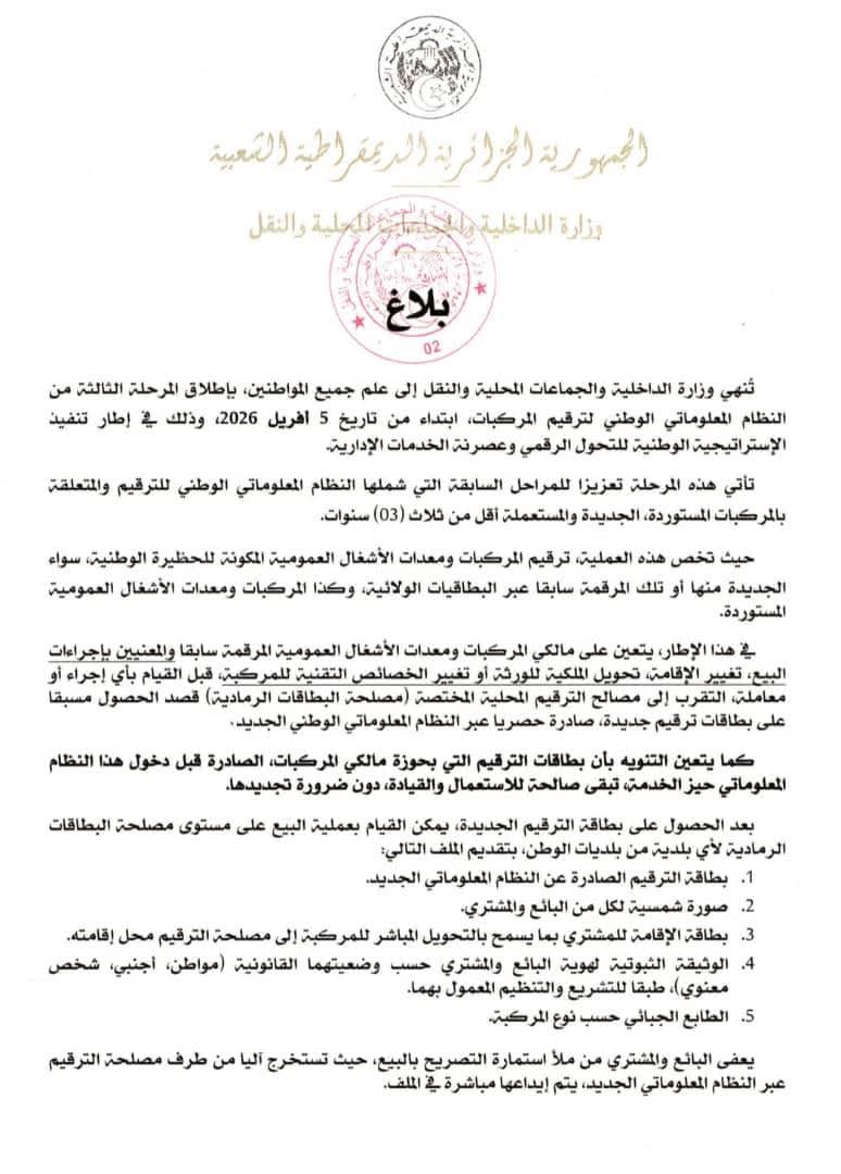 الجزائرالٱن _ أعلنت وزارة الداخلية والجماعات المحلية والتهيئة العمرانية عن الشروع في تنفيذ المرحلة الثالثة من النظام المعلوماتي الوطني لترقيم المركبات، وذلك ابتداءً من 5 أفريل 2026، في إطار مواصلة مسار التحول الرقمي وعصرنة الخدمات الإدارية.
