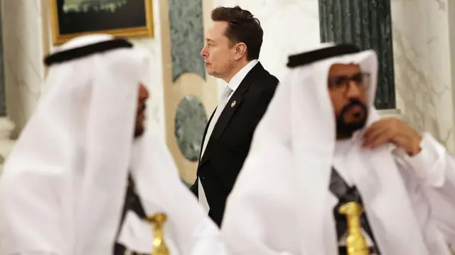 فقد كان في استقبال ترامب لدى وصوله إلى البلاط الملكي السعودي لفيف من رجال المال والأعمال الأمريكيين، ومن بينهم إيلون ماسك والمديرون التنفيذيون لشركات عملاقة مثل غوغل وأوبن إيه آي ونفيديا وأوبر، وكثير من أقطاب الأعمال الآخرين.