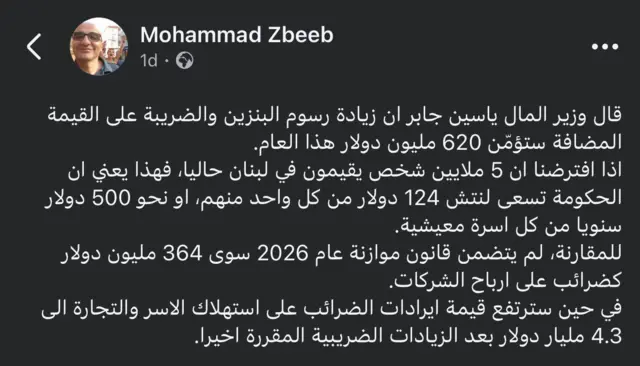 ويرى زبيب أن هدف الحكومة من رفع رسوم البنزين وضريبة القيمة المضافة هو تأمين نحو 620 مليون دولار هذا العام؛ وإذا ما قسم هذا المبلغ على عدد المقيمين في لبنان، فإن السلطة عملياً تسعى لسحب نحو 124 دولاراً من جيب كل فرد، أو ما يعادل 500 دولار سنوياً من ميزانية كل أسرة معيشية.