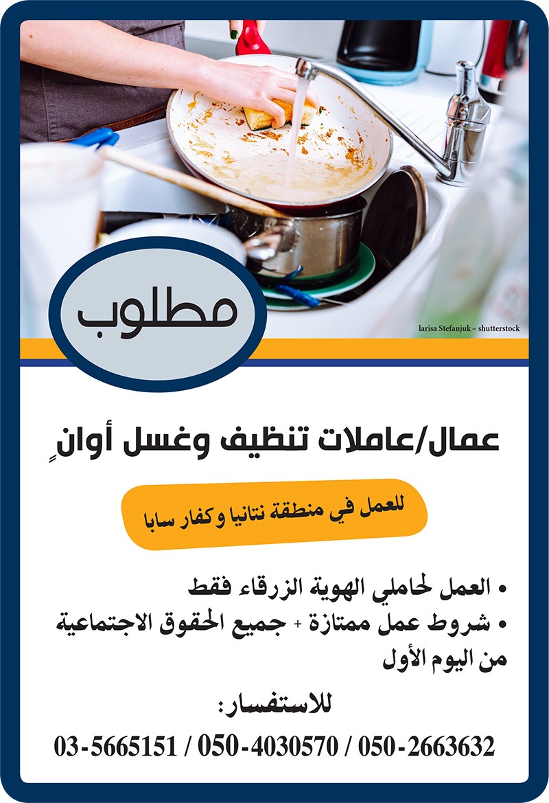 مطلوب عمال/عاملات تنظيف وغسل أوانٍ للعمل في منطقة نتانيا وكفار سابا