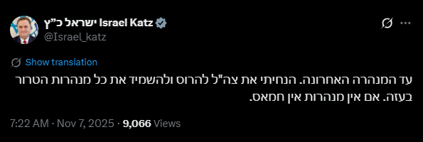 وكتب كاتس في منشور عبر حسابه على منصة "أكس": "حتى آخر نفق. أصدرت تعليماتي لجيش الدفاع الإسرائيلي بهدم جميع أنفاق الإرهاب في غزة. إن لم تكن هناك أنفاق، فلن يكون هناك حماس".