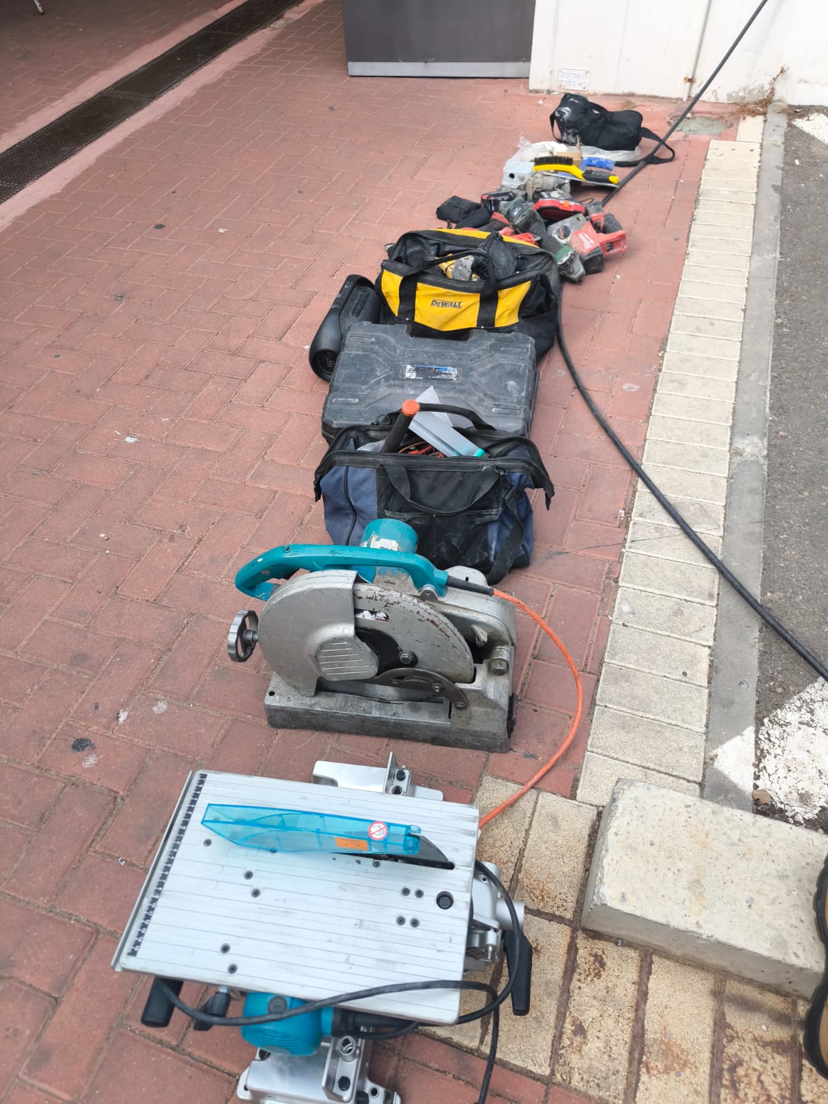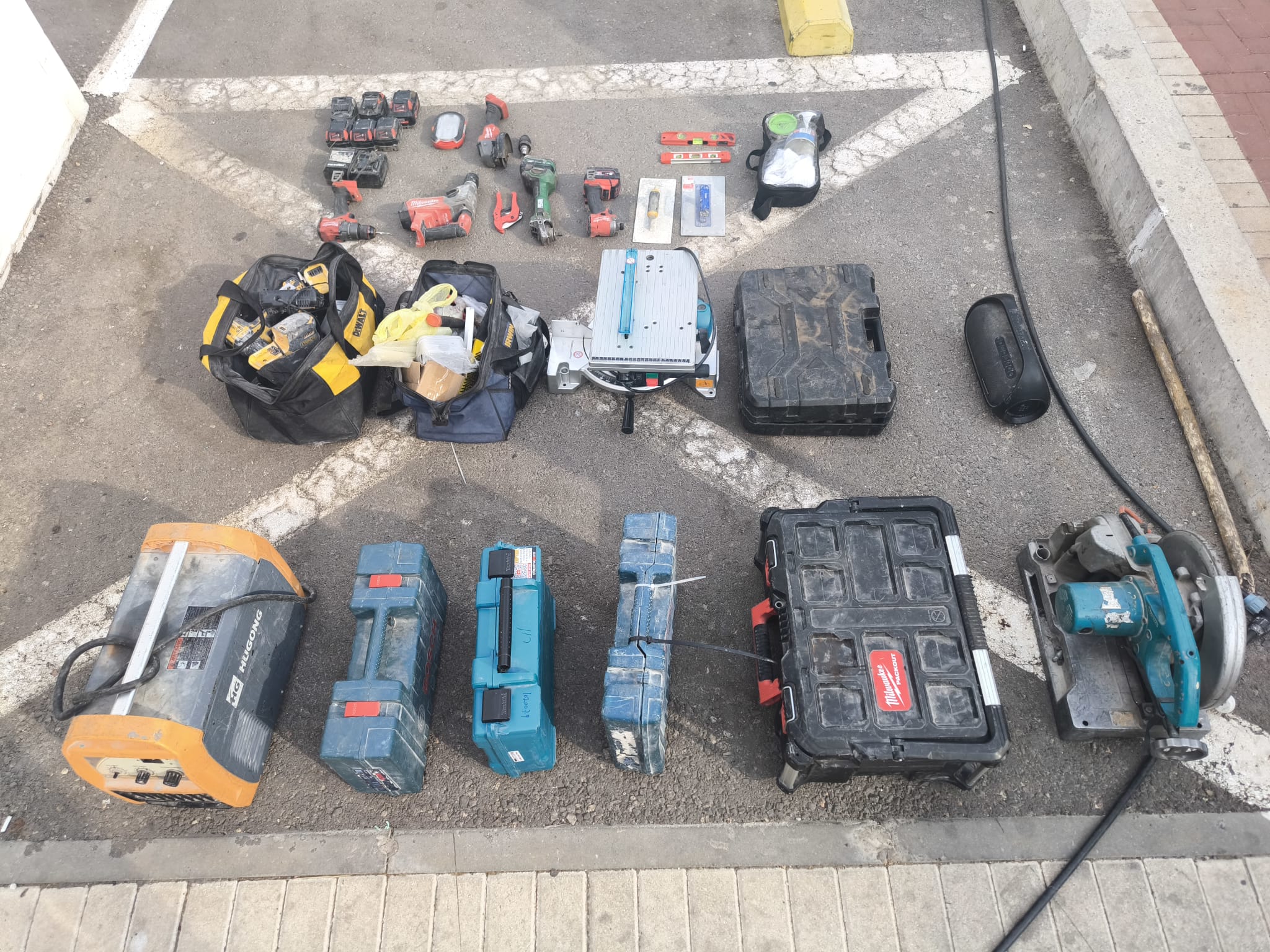 أدوات كهربائية متنوعة، ميزان، مناشير، مفكات كهربائية، مكبر صوت، معدات إضافية، ملصقات يُشتبه باستخدامها لتزوير لوحات ترخيص، وحتى ساعة “Apple” " .