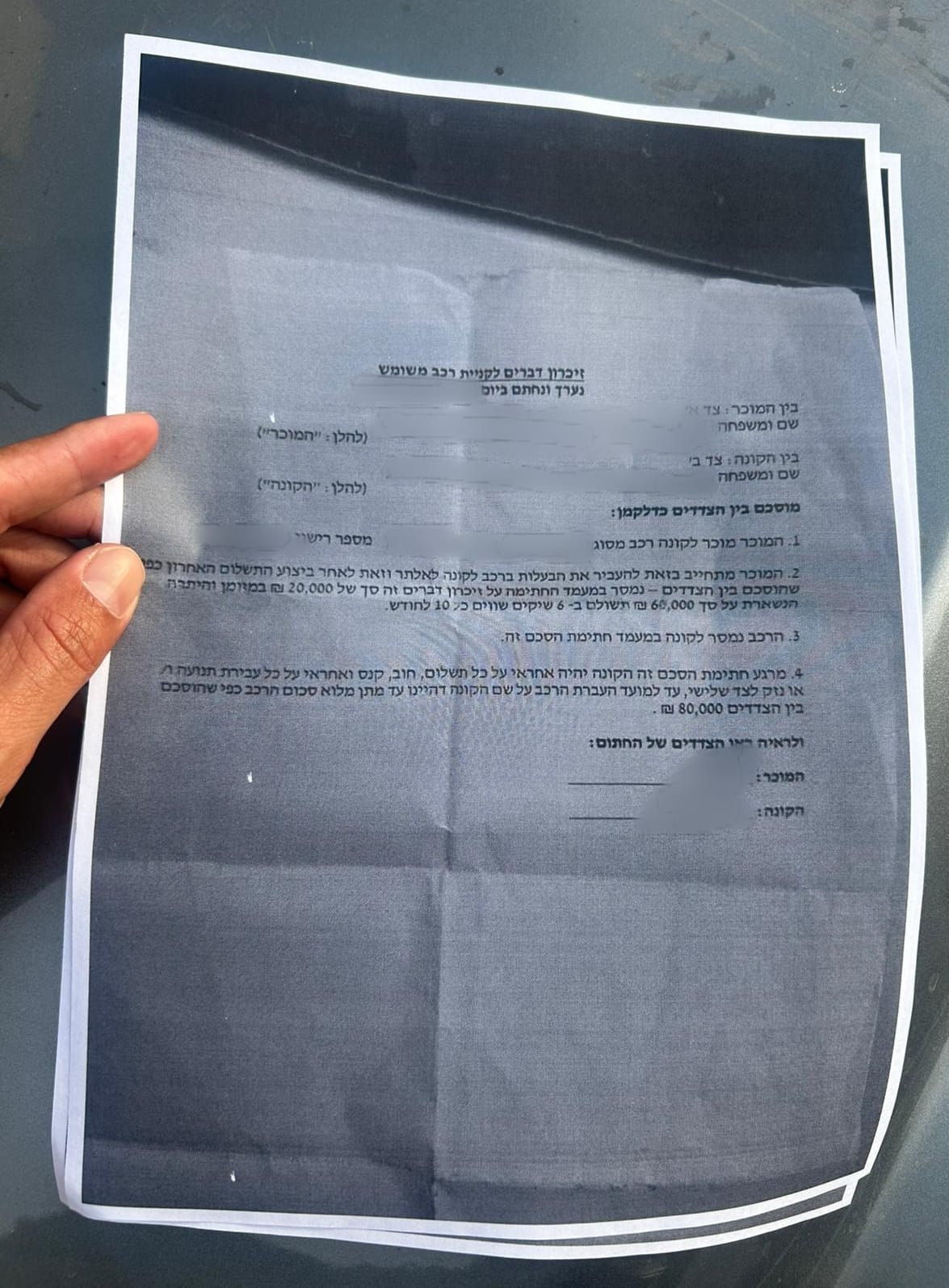 خلال فترة توقيفهما، قدّم المشتبهان (عن طريق أفراد من عائلتيهما) عقدا مبدئيا لشراء المركبة، زُعم أنه تم توقيعه مع شخص قُتل قبل أسابيع على خلفية صراع إجرامي. لكن خلال التحقيق، نجح المحققون في إثبات أن العقد مزوّر، حيث تبيّن أن السيارة بتاريخ توقيع العقد (09.11.25) كانت لا تزال بحوزة مالكها الأصلي وتحمل اللوحات الأصلية. كما تبيّن من فحص أُجري للسائق أنه كان يقود تحت تأثير المخدرات " .