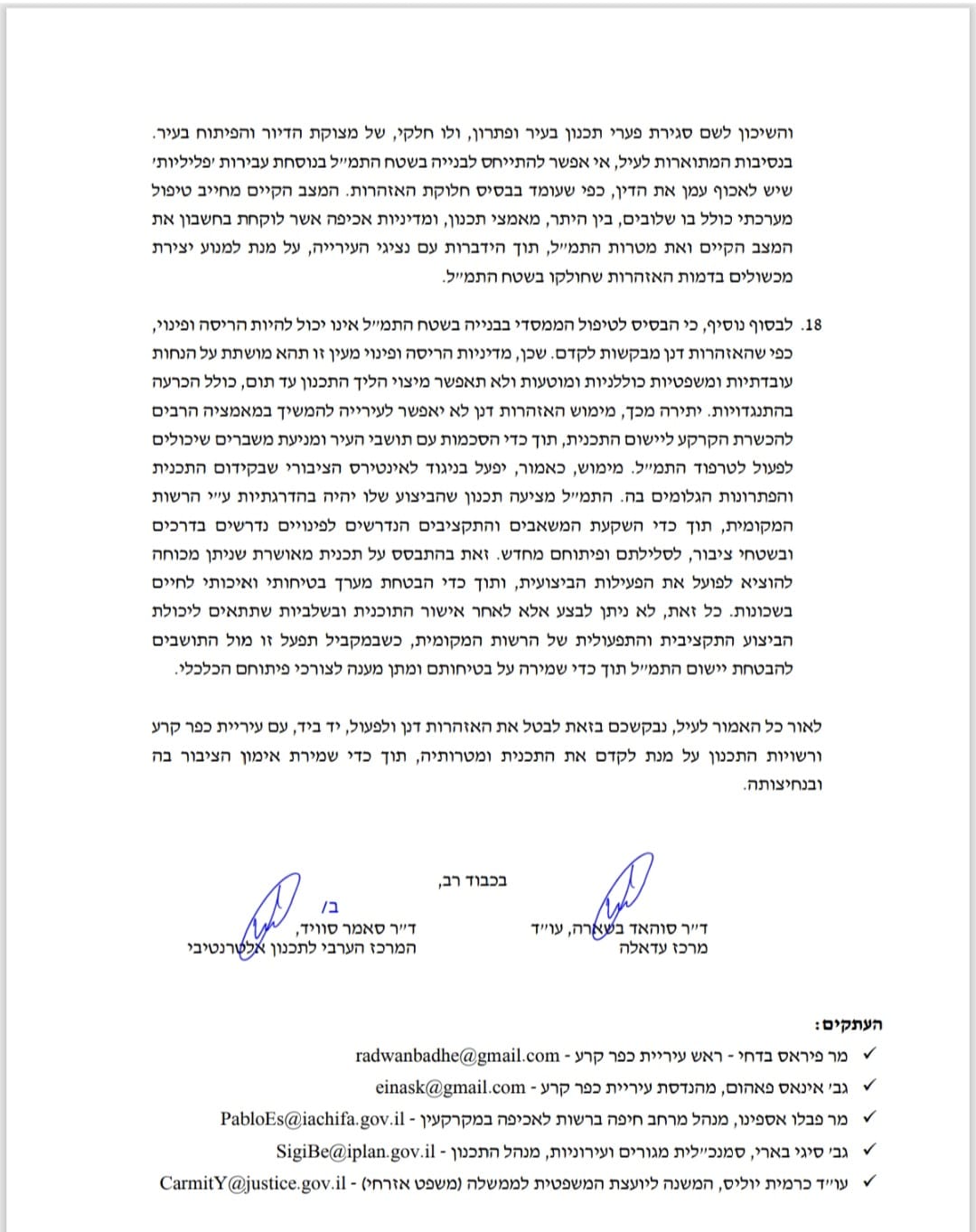 وجاء في جوهر الرسالة أنّ هذه الخطوات لا مبرّر لها قانونيًا ولا تخطيطيًا، خاصة في ظل تقدّم مراحل التخطيط للمخطط المذكور واقترابه من المرحلة الأخيرة، وذلك قبل البتّ في الاعتراضات التي قدّمها المواطنون وقبل المصادقة النهائية على الخريطة.