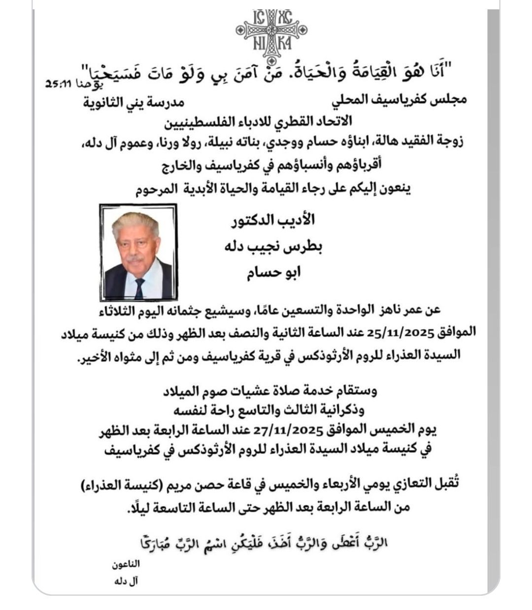 مصدر الصورة في كفر ياسيف. تقام خدمة صلاة عشيات صوم الميلاد وذكرانية الثالث والتاسع راحة لنفس الفقيد يوم الخميس الموافق 27.11.2025 عند الساعة الرابعة بعد الظهر في كنيسة ميلاد السيدة العذراء في كفر ياسيف. تقبل التعازي يومي الاربعاء والخميس في قاعة حصن مريم "كنيسة العذراء" من الساعة الرابعة بعد الظهر حتى التاسعة مساء.