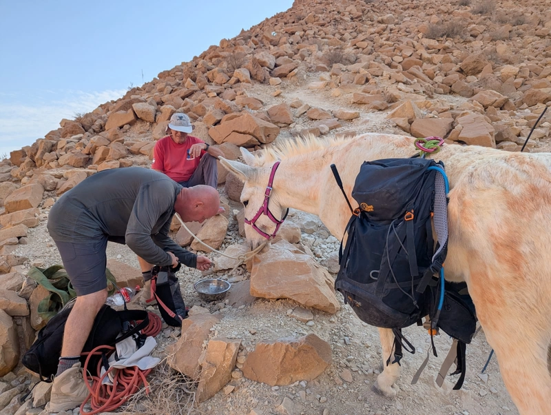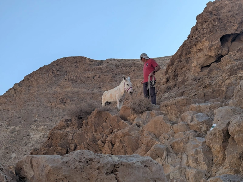 يقول شاي روزنزويج، مفتش ساحل البحر الميت ومحمية عين جدي الطبيعية: "وصلنا أمس الساعة السادسة والنصف صباحًا لننزل إلى حيث كان الحمار. انضممتُ إلى فريق وحدة إنقاذ عراد، وسلكنا معًا الطريق المنحدر المؤدي إلى البركة. عندما وصلنا، رأينا الحمار في حالة جيدة، لكن يبدو أنه عالق في البركة منذ أيام. أخرجناه من البركة وبدأنا نصعد النهر. استغرقت عملية الإنقاذ بأكملها حوالي أربع ساعات من المشي الشاق في الحر الشديد، لكننا لم نشك في ضرورة إخراجه من هناك. لو بقي حتى هطول الأمطار، لربما جرفه الفيضان."