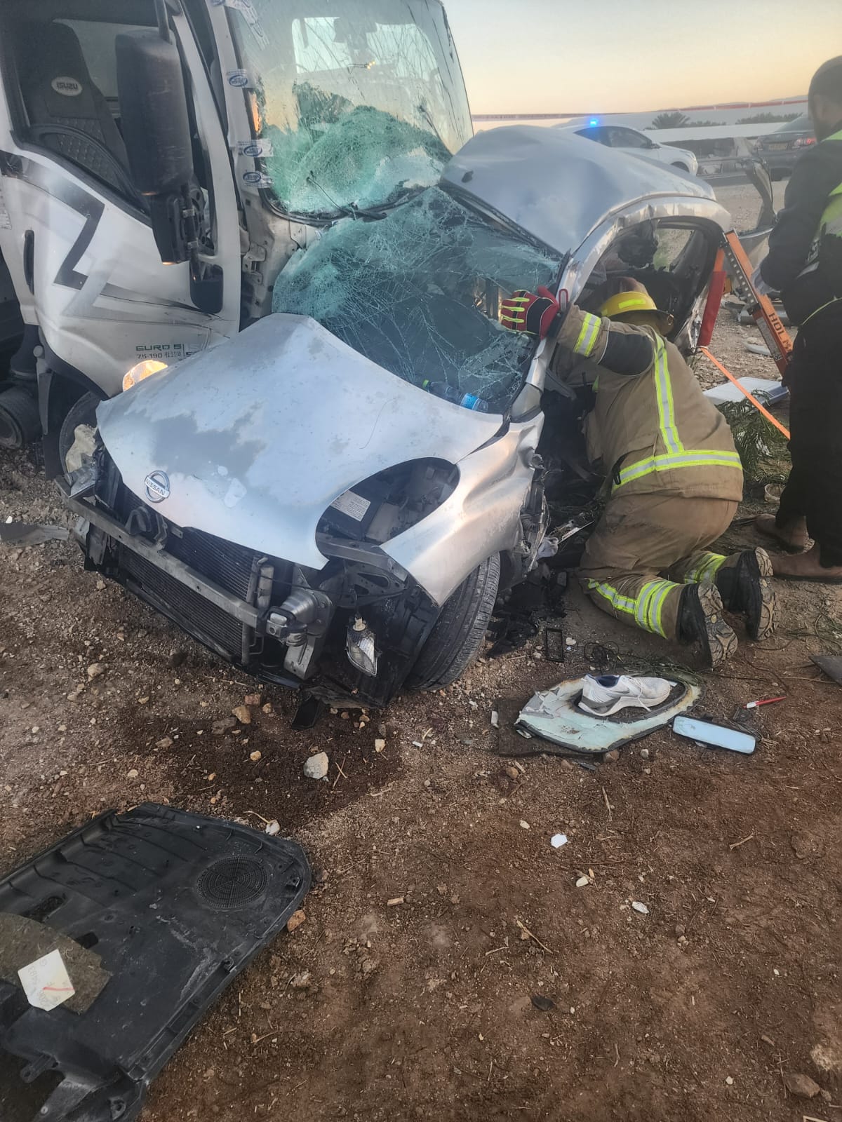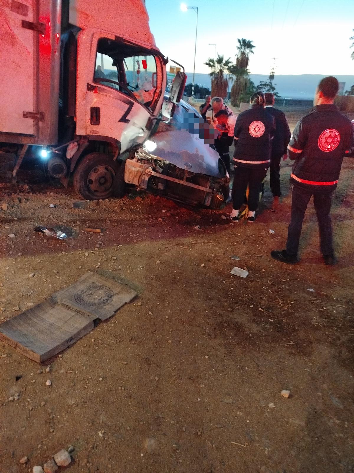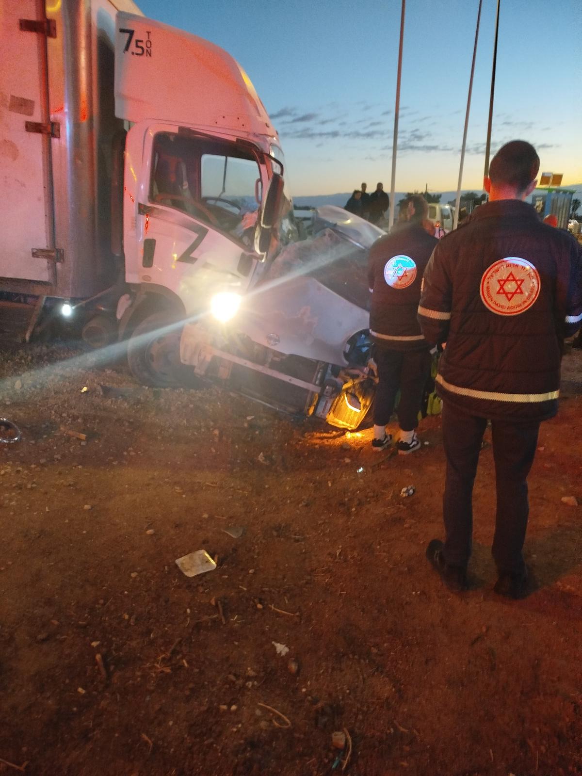 والانقاذ في لواء الضفة الغربية بلاغا حول حادث طرق في مفرق ألموغ . لدى وصول الطواقم اتضح ان الحادث كان جراء اصطدام شاحنة وسيارة وان عالقيْن داخل السيارة . الطواقم تمكنت من تخليص العالقين ، واتضح أنهما فارقا الحياة وتم نقلهما للطواقم الطبية التي أعلنت وفاتهما" .