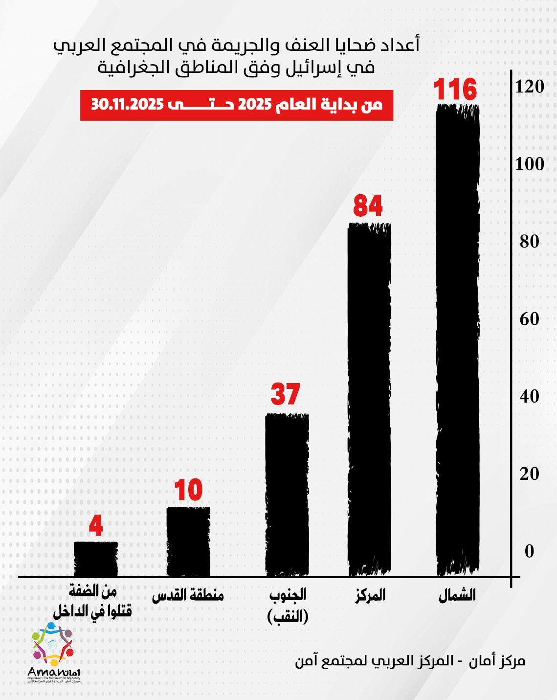 وأظهر التقرير أيضاً أن منطقة الشمال ما تزال تتصدر المشهد بـ 116 ضحية، تليها منطقة المركز التي شهدت 84 ضحية، ثم النقب بـ 37 ضحية. كما سجلت القدس وضواحيها 10 ضحايا، فيما وثّقت 4 حالات قتل لضحايا من الضفة الغربية داخل حدود 48 جميعها مرتبطة بالجريمة المنظمة.