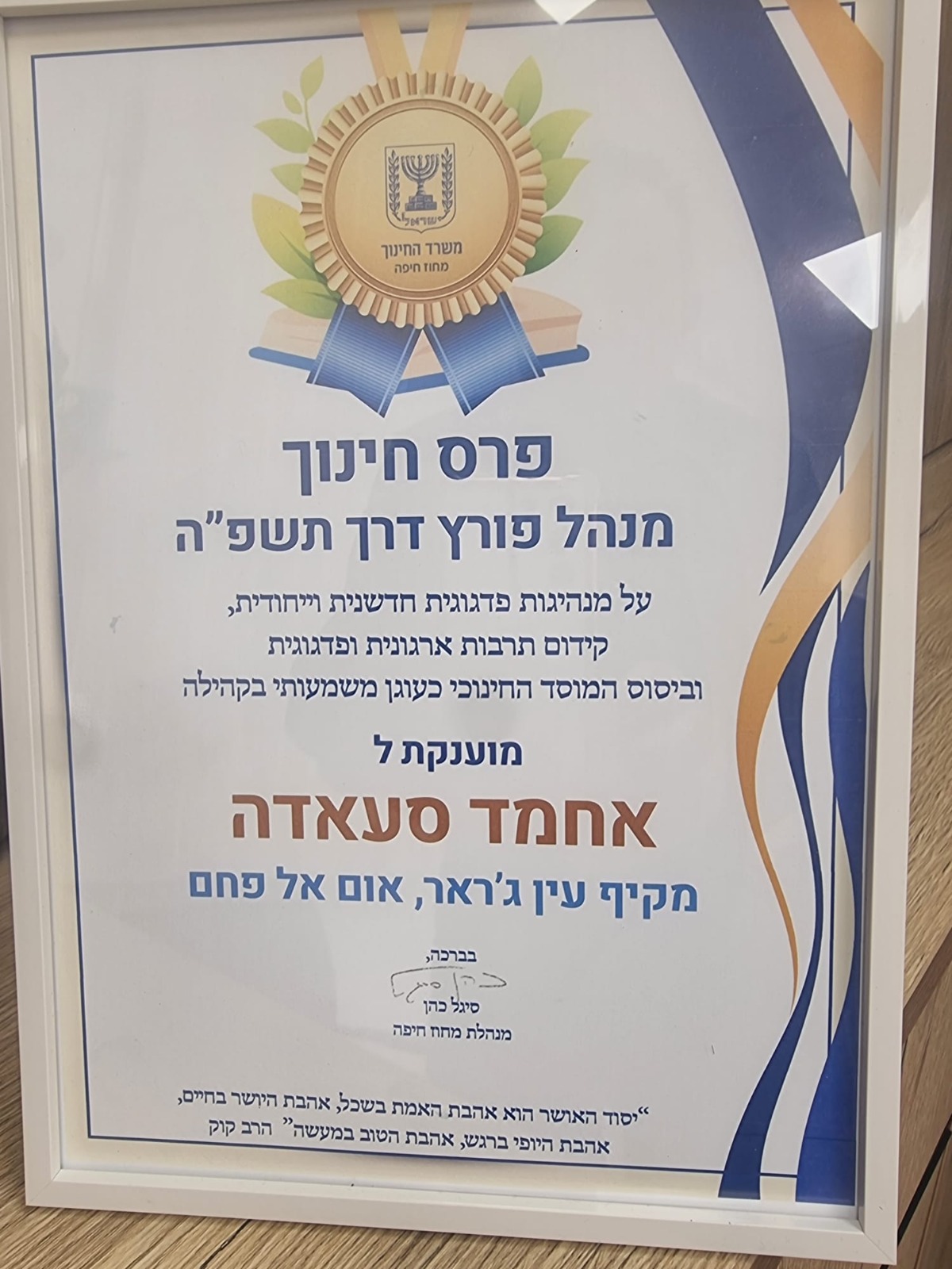 وقد تسلم الأستاذ احمد سعادة، مدير مدرسة التسامح الشاملة جائزة اللواء، بحصوله على لقب "المدير الرائد" (מנהל פורץ דרך)، حيث شارك في حفل التكريم نيابة عن بلدية ام الفحم مدير جناح المعارف د.محمود زهدي.