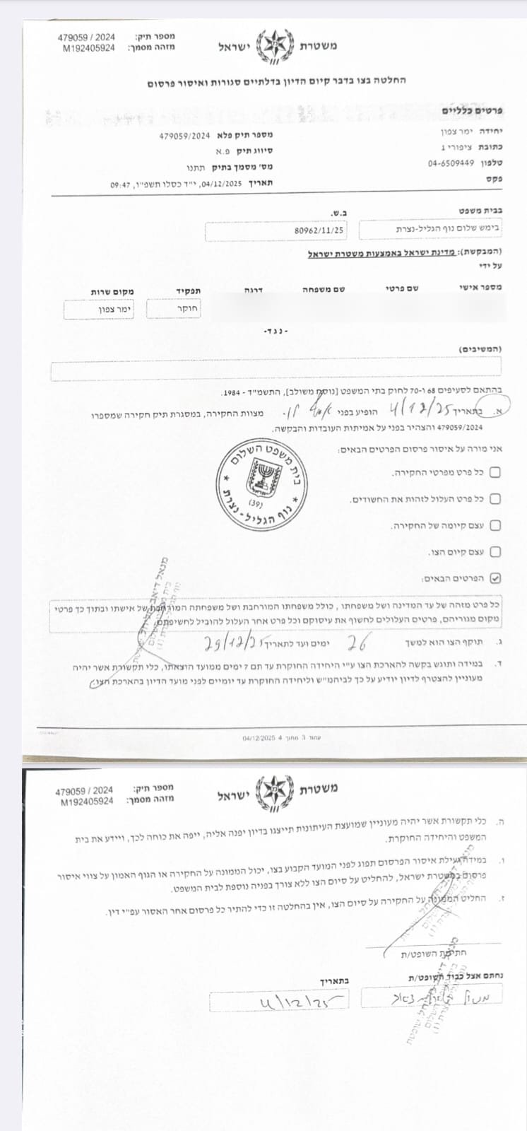وجاء في البيان أن سعادة القاضية منال خلايلة ذياب من محكمة الصلح في نوف هجليل – الناصرة، قررت تمديد أمر الحظر حتى تاريخ 29 ديسمبر 2025.