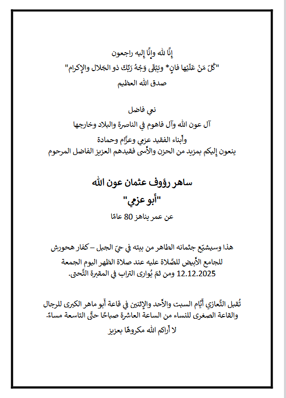 للجامع الأَبيض للصَّلاة عليه عند صلاة الظهر اليوم الجمعة 12.12.2025 ومن ثمّ يُوارى التراب في المقبرة التَّحتى.