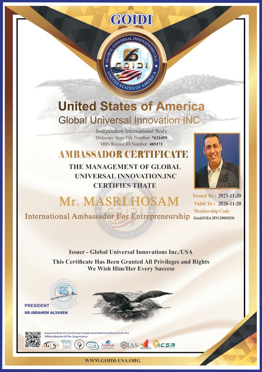 أعلنت الهيئة العالمية الأمريكية للريادة الدولية (GOIDI)، ومقرها نيويورك، عن تعيين المستشار حسام المصري سفير دولي (Ambassador)، وذلك تقديرًا لجهوده المتواصلة خلال عام 2025 في مجالات العمل المجتمعي والإنساني،