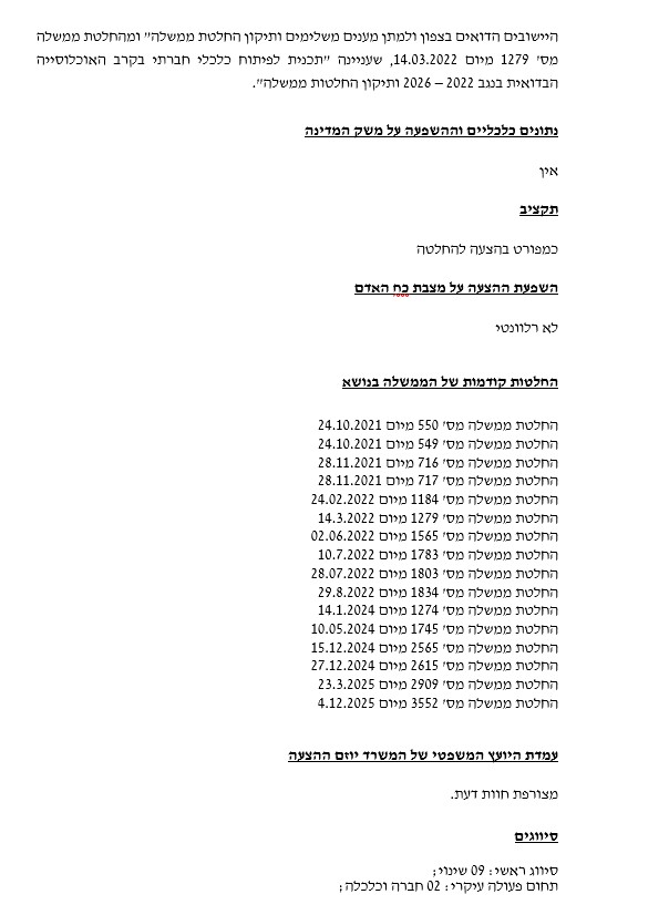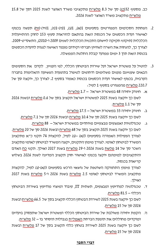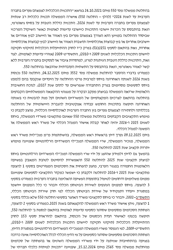 على تقليص بمئات ملايين الشواقل من ميزانية الخطة الخمسية المخصّصة لتطوير المجتمع العربي، وذلك بناءً على توصية وزيرة المساواة الاجتماعية ووزير الأمن القومي ".