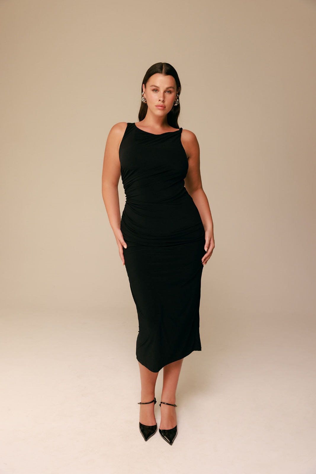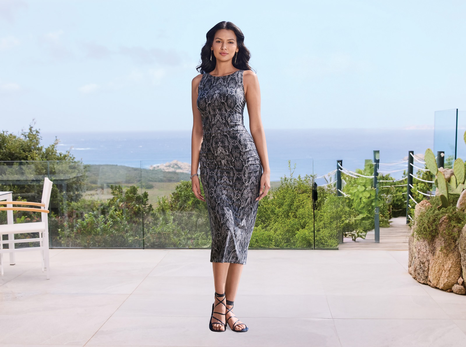 لا حاجة لارتداء مشدّ إضافي فالقماش نفسه ينحت المنحنيات بلطف ويخلق خطا انسيابيا نظيفا ، النتيجة حضور أنثوي آسر مليء بالثقة.