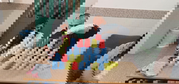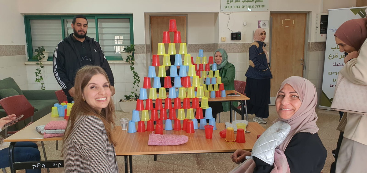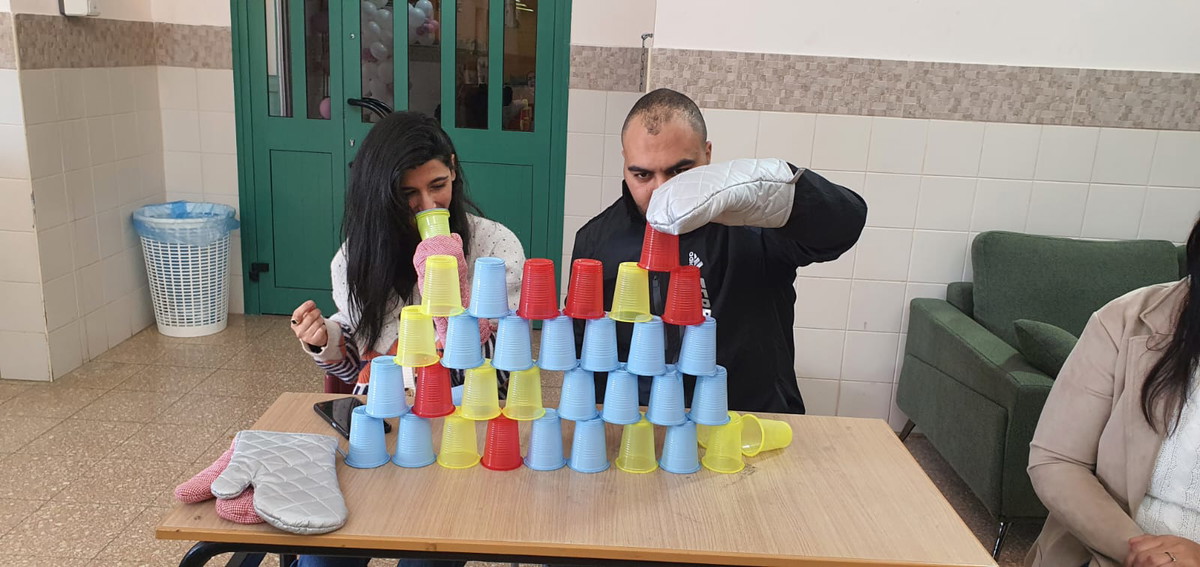 وورشة فقدان القدرة على استخدام العضلات الدقيقة، من خلال ارتداء قفازات سميكة ومحاولة تركيب برج من الكاسات البلاستيكية.