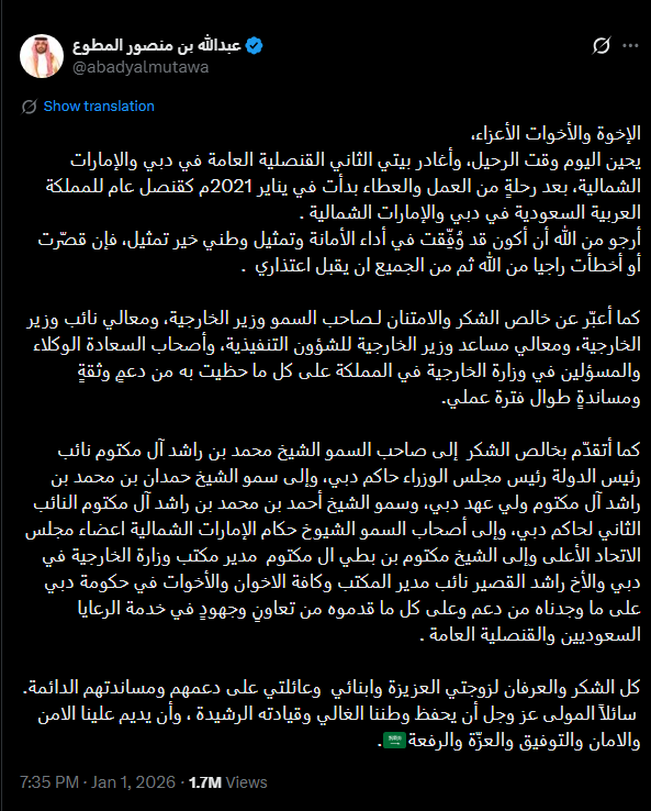 أعلن القنصل السعودي في دبي عبد الله المطوع، أمس الخميس، مغادرته منصبه، من دون أن يذكر الأسباب.
