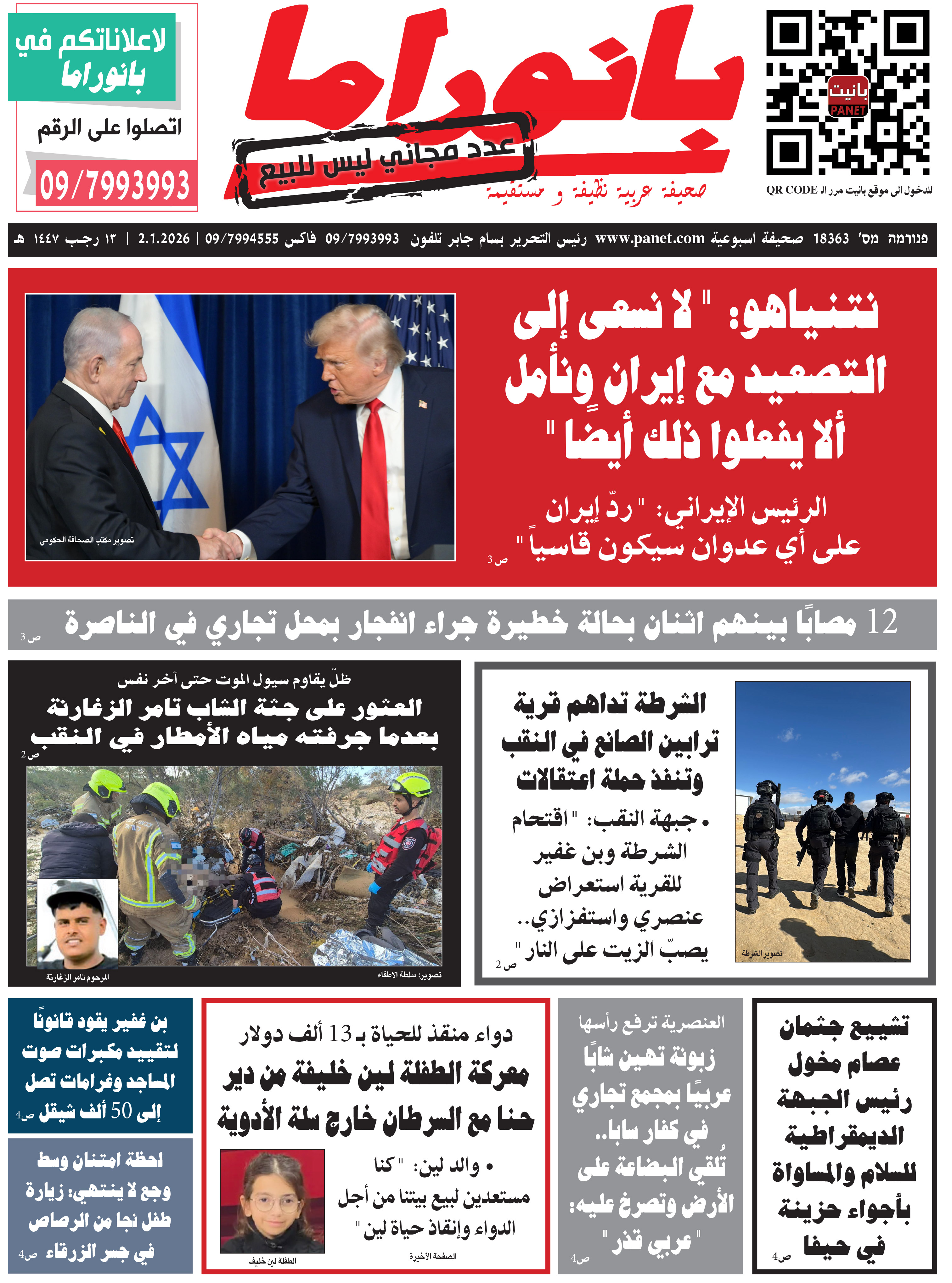 ننشر لزوار موقع بانيت الكرام العدد الجديد من صحيفة بانوراما، اقوى الصحف العربية في البلاد والاكثر شعبية على الاطلاق ، والذي صدر صباح اليوم الجمعة ، الموافق 2.1.2026.