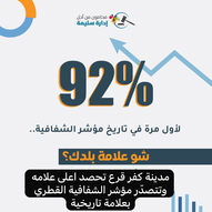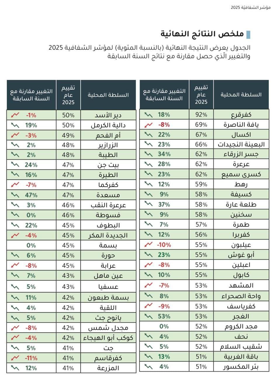 سجّلت مدينة كفرقرع إنجازًا نوعيًا وغير مسبوق، بتصدّرها مؤشر الشفافية القطري وحصولها على أعلى علامة في تاريخ مؤشر الشفافية منذ إطلاقه، وذلك بنسبة 92%، في سابقة تُعد الأولى من نوعها على مستوى السلطات المحلية العربيه بالبلاد.