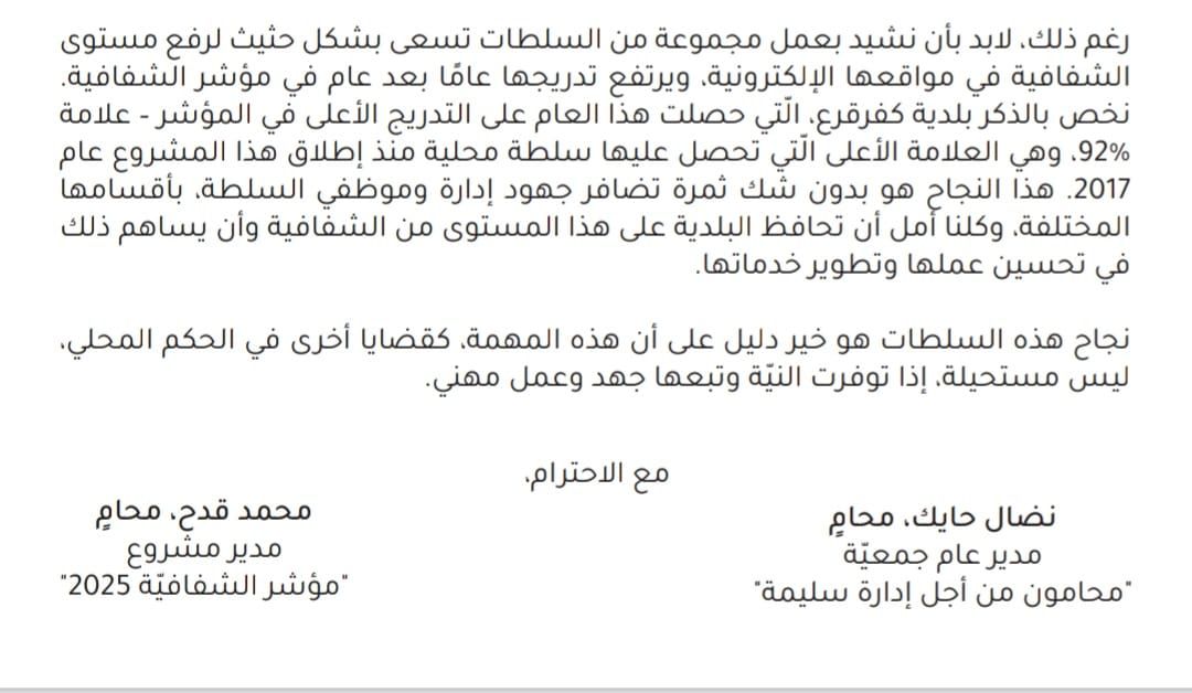 وجاء هذا الإنجاز في ظل قيادة رئيس بلدية كفرقرع، المحامي فراس أحمد بدحي، الذي قاد مع طاقم البلدية مسارًا مهنيًا واضحًا يقوم على تعزيز النزاهة، ترسيخ الشفافية، وتطوير الخدمات الرقمية، بما يضع المواطن بصوره شفافه في صلب العمل البلدي ويعزّز الثقة بين السلطة المحلية والجمهور.