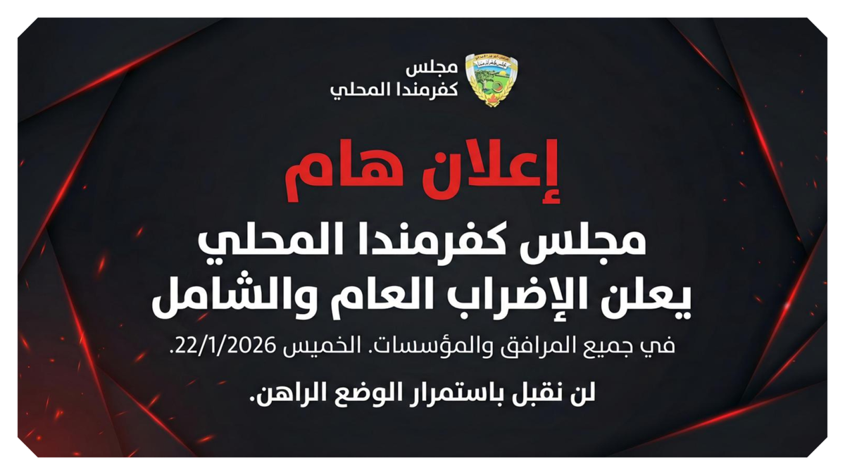 ويدعو المجلس المحلي أهالي كفرمندا إلى الالتزام الجاد بالإضراب، لأن هذه الوقفة ليست إجراءً شكليًا، بل رسالة واضحة في وجه المجرمين والجريمة: مجتمعنا موحّد، وكرامتنا وأمننا خط أحمر.