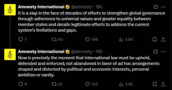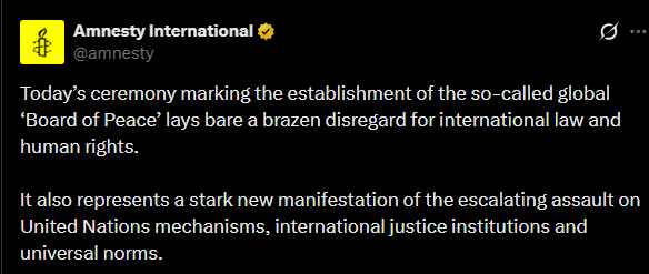 وفي تدوينة عبر منصة "إكس" قالت المنظمة إن مراسم الإعلان عن تأسيس ما يسمى بمجلس السلام العالمي تكشف عن تجاهل صارخ للقانون الدولي وحقوق الإنسان، معتبرة أن هذه الخطوة تمثل تصعيدا خطيرا جديدا في الهجوم على منظومة الأمم المتحدة وآلياتها، ومؤسسات العدالة الدولية، والمعايير العالمية المعتمدة.