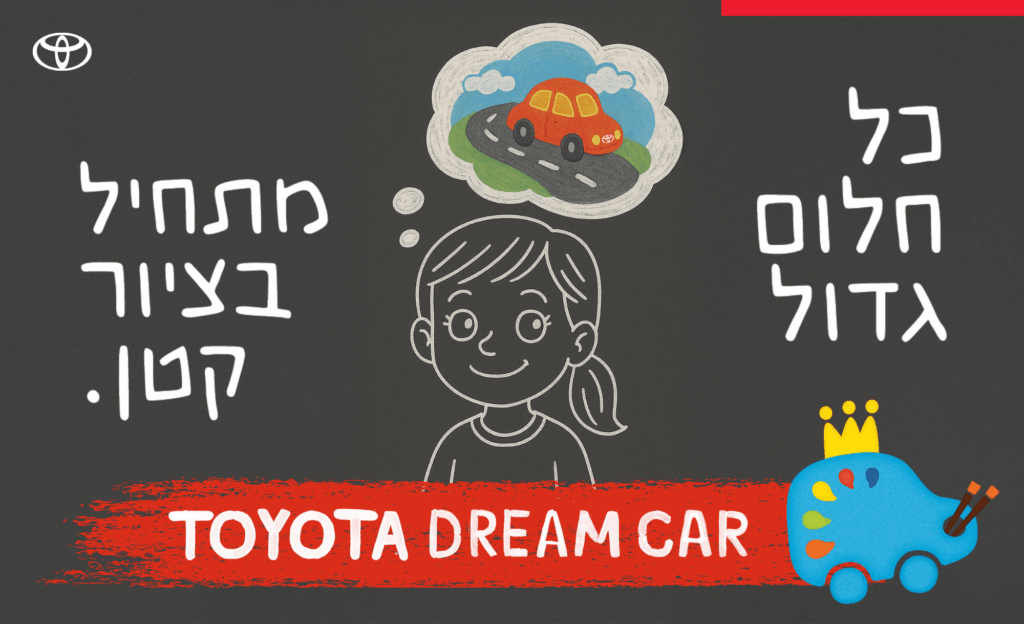 تُطلق يونيون موتورز ، المستوردة الرسمية ل تويوتا في إسرائيل، مسابقة الرسومات العالمية Toyota Dream Car وهي مسابقة سنوية تُقام هذا العام للسنة الـ19 على التوالي، وتدعو الأطفال واليافعين من مختلف أنحاء البلاد إلى رسم سيارة أحلامهم ، وكيف يمكن لها أن تُغيّر الطريقة التي نتحرّك بها في العالم .