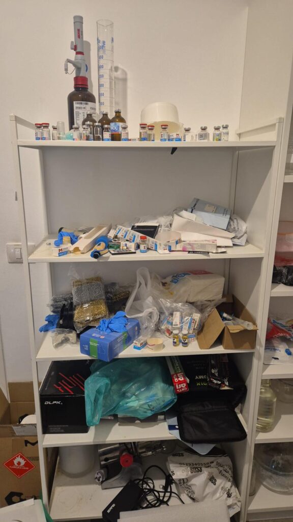 وخلال التفتيش، ضبطت القوات زيوتًا في قوارير، ومواد مختلفة تُستخدم في إنتاج أدوية يُشتبه بأنها ستيرويدات بنائية، إلى جانب مساحيق وسوائل مشبوهة، وكبسولات فارغة استُخدمت لإعداد منتجات غير مسجّلة أو مصادق عليها من قبل وزارة الصحة.