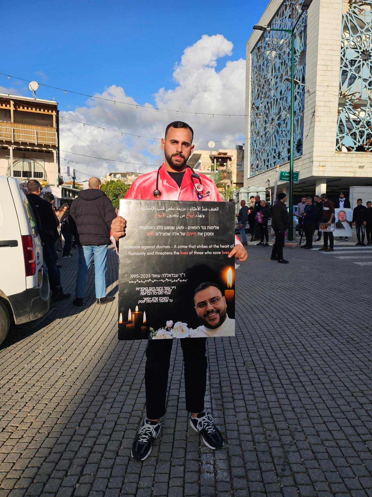 وشارك في المظاهرة عدد كبير من الأطباء وزملاء المرحوم، حيث ارتدى بعضهم الزي الطبي، فيما ارتدى آخرون زيًا طبيًا ملطخًا بالدم، في خطوة احتجاجية رمزية تعكس الغضب من استمرار العنف والجريمة، ومن غياب العدالة بعد مرور عام كامل دون كشف ملابسات الجريمة أو محاسبة الجناة.