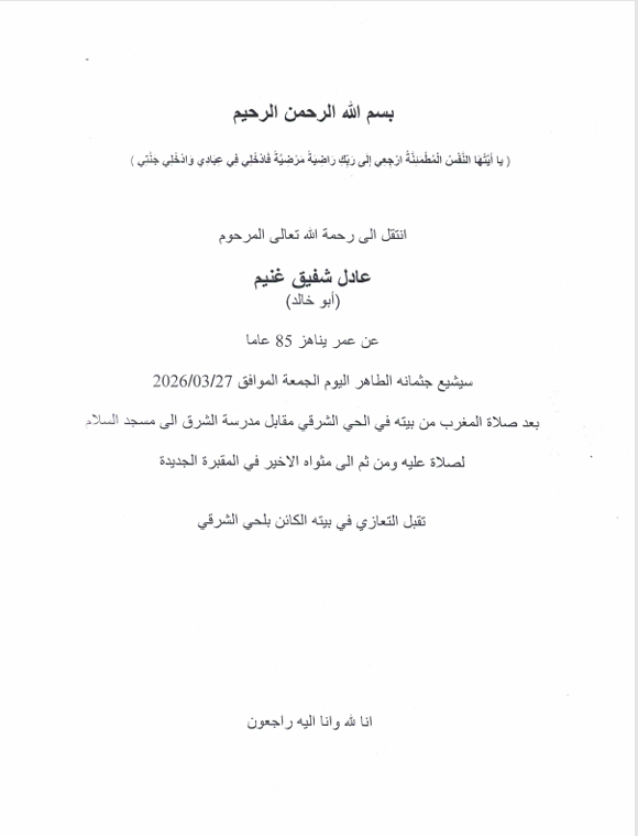انتقل إلى رجمة الله تعالى في مدينة الناصرة، عادل شفيق غنيم عن عمر ناهز الـ(85 عامًا). وسيشيّع جثمانه الطاهر اليوم الجمعة، الموافق 27/03/2026 بعد صلاة المغرب من بيته الكائن في الحي الشرقي مقابل مدرسة الشرق إلى مسجد السلام.