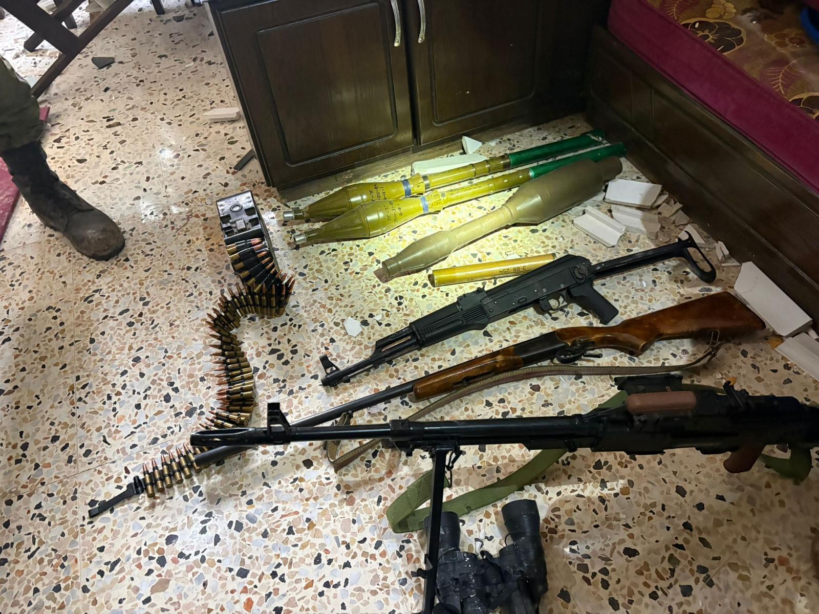 واضاف البيان: " في عدة مداهمات مركّزة لمبانٍ عسكرية كانت تُستخدم من قبل التنظيم، تم العثور على مخازن كبيرة من الوسائل القتالية، من بينها: صواريخ مضادة للدروع، قذائف RPG، صواريخ، بنادق كلاشينكوف وذخيرة" .