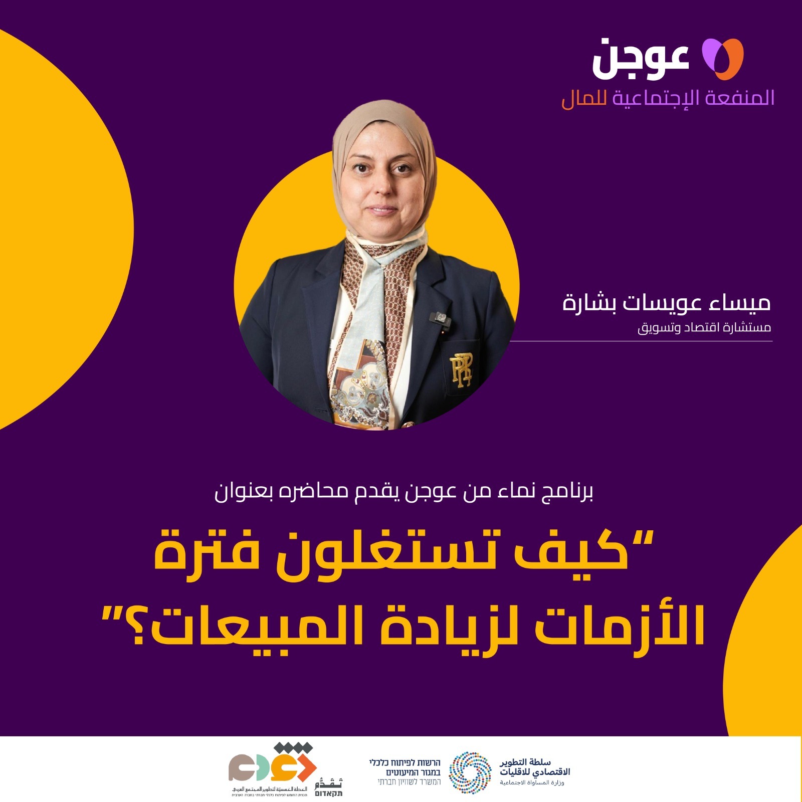 أقام برنامج نماء من عوجن، أمس الثلاثاء الموافق 14.04.2026، محاضرة مهنية بعنوان "كيف تستغلون فترة الأزمات لزيادة المبيعات؟"، قدّمتها المستشارة الاقتصادية والتسويقية ميساء عويسات بشارة،