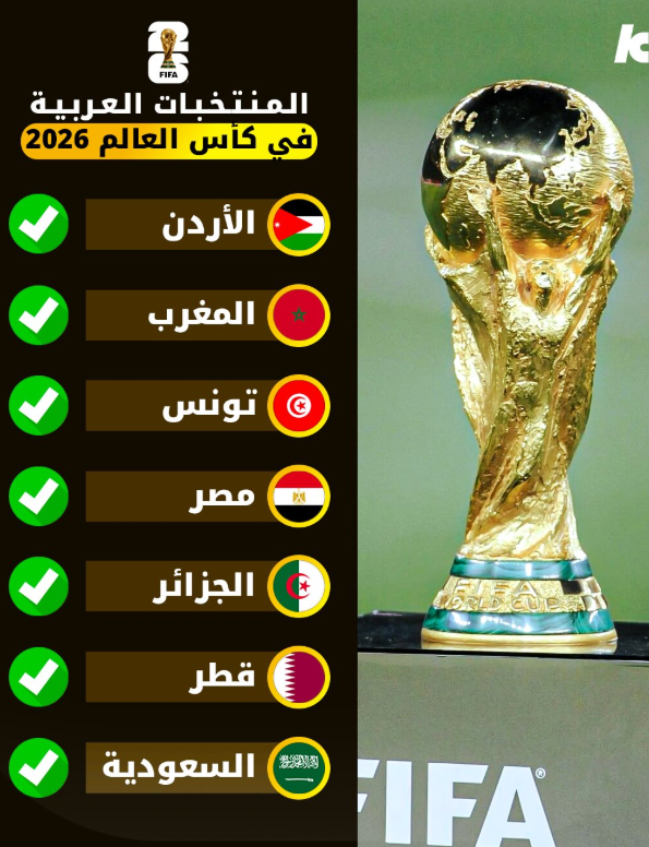 مشاركة تاريخية للعرب في مونديال 2026 .. في إنجاز غير مسبوق، نجحت سبعة منتخبات عربية في حجز مقاعدها في كأس العالم 2026 وهي: المغرب، تونس، الجزائر، مصر، الأردن، السعودية، وقطر.