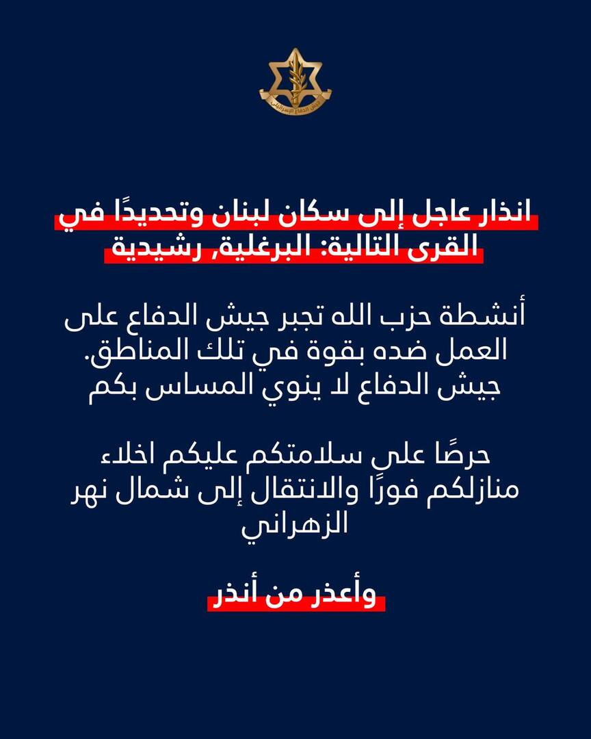 وذكر المتحدث باسم الجيش الإسرائيلي أفيخاي أدرعي في بيان: "إنذار عاجل إلى سكان لبنان وتحديدا في القرى التالية: البرغلية، الرشيدية".