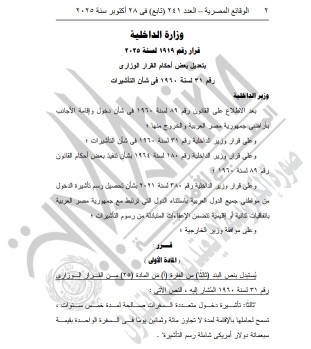 نشرت الجريدة الرسمية قرارا لوزير الداخلية يحمل رقم قرار رقم 1919 لسنة 2025 بتعديل بعض أحكام القرار الوزاري رقم 31 لسنة 1960 في شأن التأشيرات بوجود تسهيلات جديدة بشأن تحصيل رسم تأشيرة الدخول من مواطنى جميع الدول العربية باستثناء الدول التي ترتبط مع جمهورية مصر العربية باتفاقيات ثنائية أو إقليمية تتضمن الإعفاءات المتبادلة من رسوم التأشيرات: