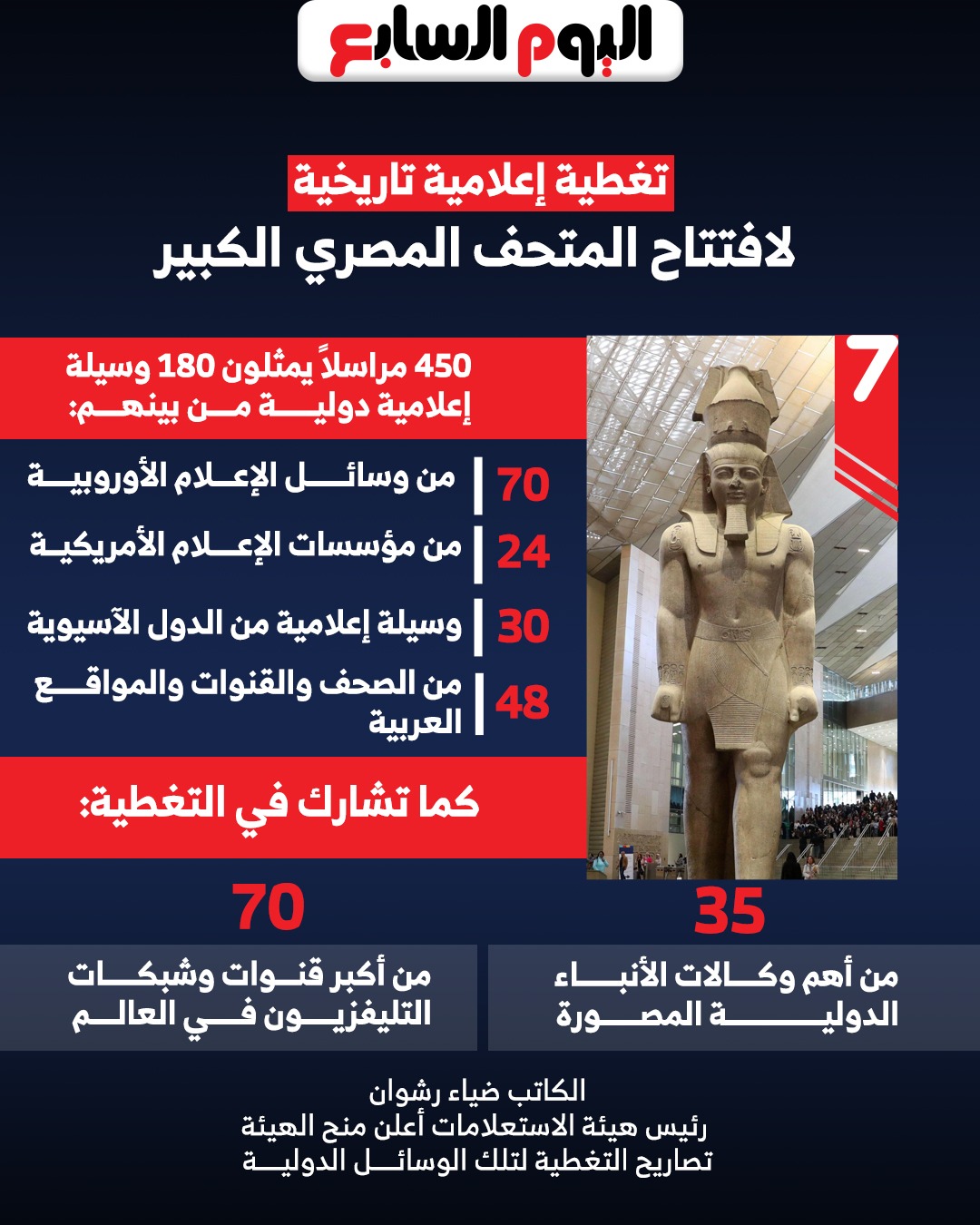 أعلن الكاتب الصحفي ضياء رشوان رئيس الهيئة العامة للاستعلامات، أن المئات من قنوات وشبكات التليفزيون والمنصات الإعلامية الدولية سوف تنقل على الهواء مباشرة وقائع افتتاح المتحف المصري الكبير إلى مئات الملايين من شعوب العالم، الذين ينتظرون متابعة هذا الحدث الثقافي – السياحي- التاريخي، غير المسبوق في أهميته ودلالته بالنسبة للمهتمين بالإرث الحضاري الإنساني، فضلاً عن الأهمية التي يضفيها على هذا الافتتاح؛ مشاركة أكبر حشد من قادة وزعماء ومسئولي دول العالم والرموز الثقافية والإعلامية في المجتمع الدولي.