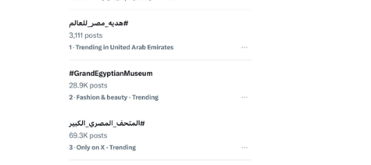 في لحظة تاريخية تصدّر المتحف المصري الكبير ، قوائم الترند على منصة "اكس" في عدد من الدول العربية، في حدث يعبّر عن عودة مصر الحضارية بقوة على الساحة العالمية.